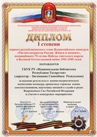 По итогам первого, республиканского, этапа за высокие результаты в военно-патриотическом воспитании молодёжи, пропаганду героизма наших соотечественников на фронтах Великой Отечественной войны и в тылу Национальная библиотека Республики Татарстан награждена дипломом 1 степени.