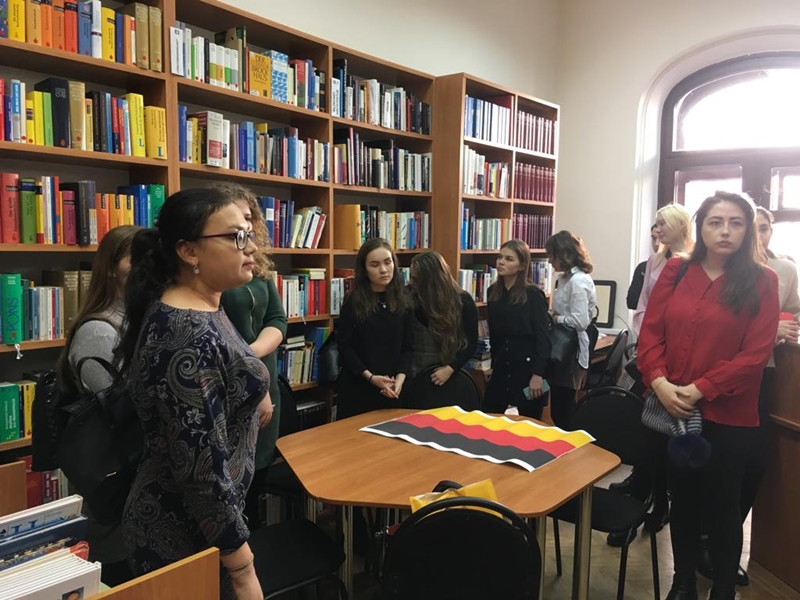 Мероприятия начались с экскурсии по Немецкому читальному залу, который предоставляет доступ к актуальной информации о Германии, её современной культуре. В распоряжении зала имеется периодика, аудио и видео уроки, обучающие программы, современная художественная литература на немецком языке, а также фильмы по страноведению. Всё это помогает эффективнее изучать язык.