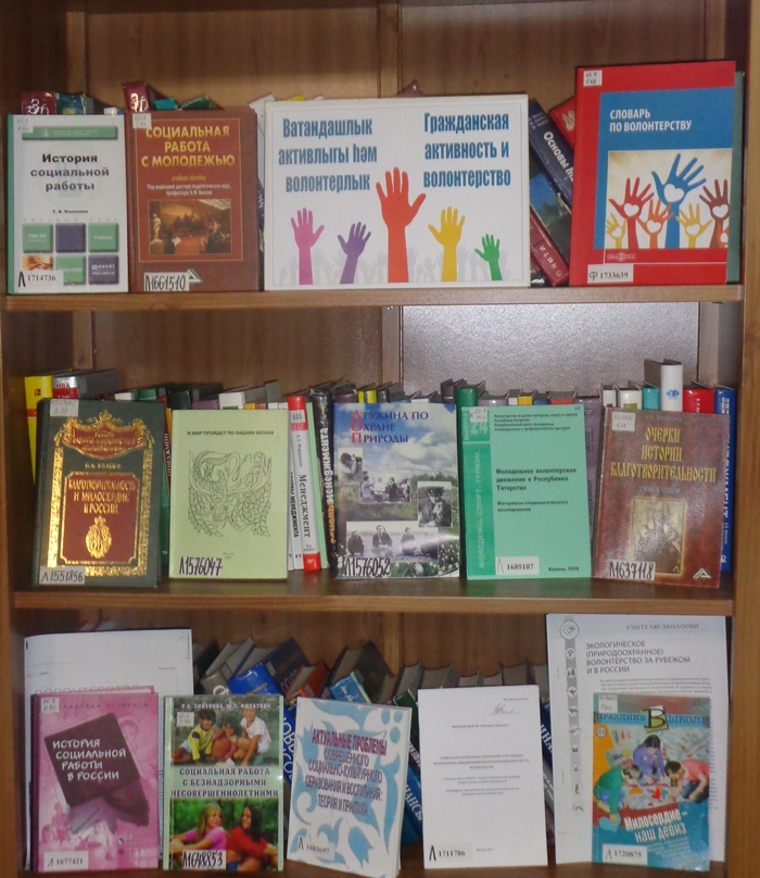 Тематическая выставка книг раскрывает характерные особенности волонтёрства – деятельности человека, совершаемой добровольно на благо общества или отдельных социальных групп, без расчёта на вознаграждение. Работа волонтёров направлена на актуальные стороны современной жизни. Это охрана природы, социальная помощь нуждающимся (инвалидам, бездомным, несовершеннолетним и другим категориям людей), благотворительность, проведение массовых культурных, спортивных, образовательных и других видов мероприятий. Также представлена литература по развитию молодёжного волонтёрского движения в Республике Татарстан. Выставка организована в рамках объявленного в 2018 году в России Года добровольца (волонтёра) и приурочена к Международному дню добровольца, отмечаемому во многих странах 5 декабря.