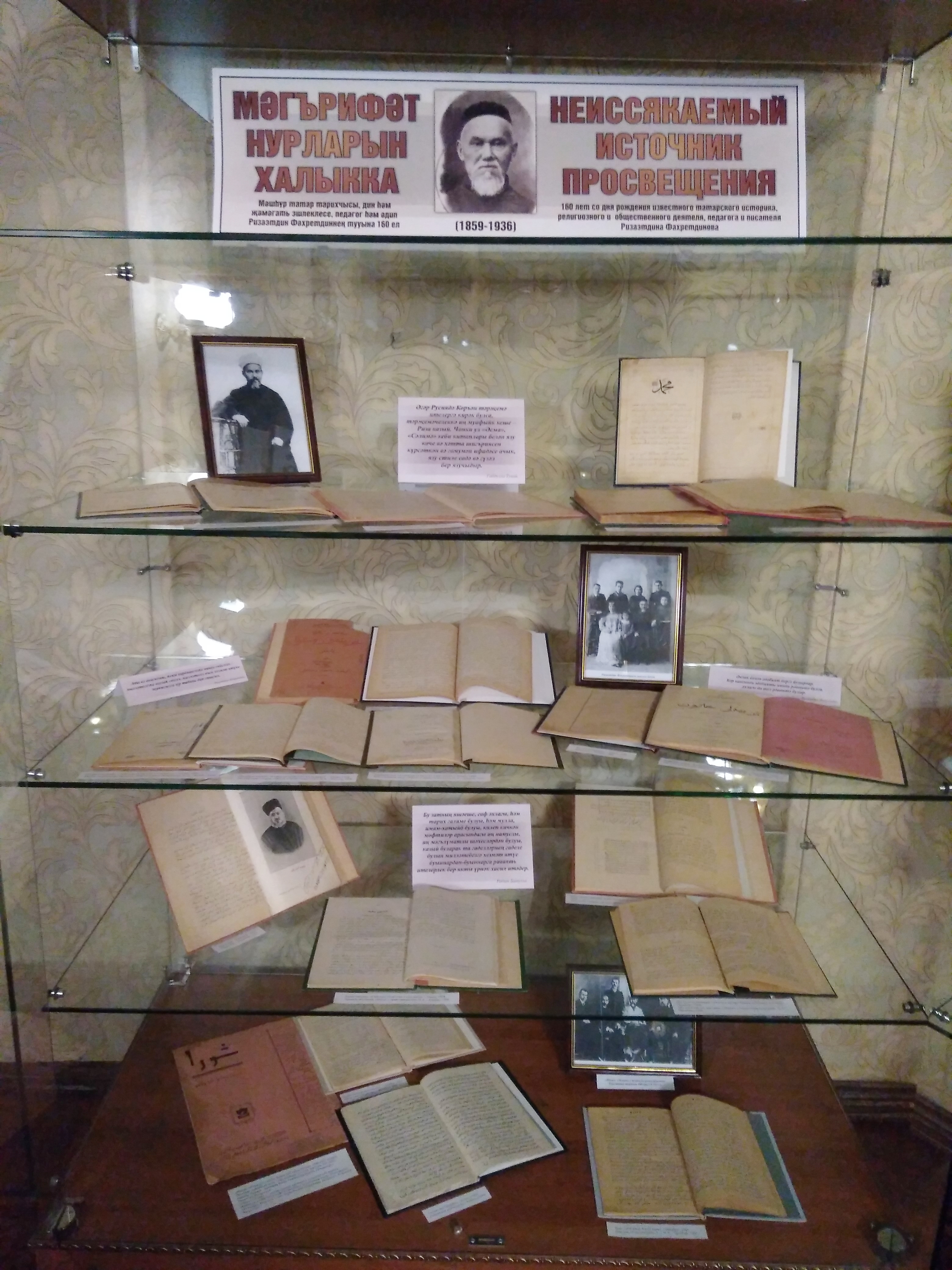 В Выставочном зале Национальной библиотеки Республики Татарстан (ул. Кремлёвская, д. 33) начала работать выставка отдела рукописей и редких книг «Неиссякаемый источник просвещения», посвящённая 160-летию со дня рождения Ризаэтдина Фахретдинова (1859–1936).