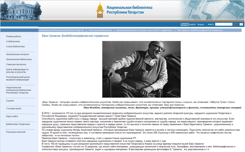 К 115 – летию со дня рождения основоположника татарского изобразительного искусства, видного деятеля татарской культуры, народного художника Татарстана и Российской Федерации, лауреата Государственной премии имени Г.Тукая Баки Урманче информационно-библиографический отдел НБ РТ подготовил и разместил на сайте новый электронный справочник - http://kitaphane.tatarstan.ru/rus/urmanche.htm