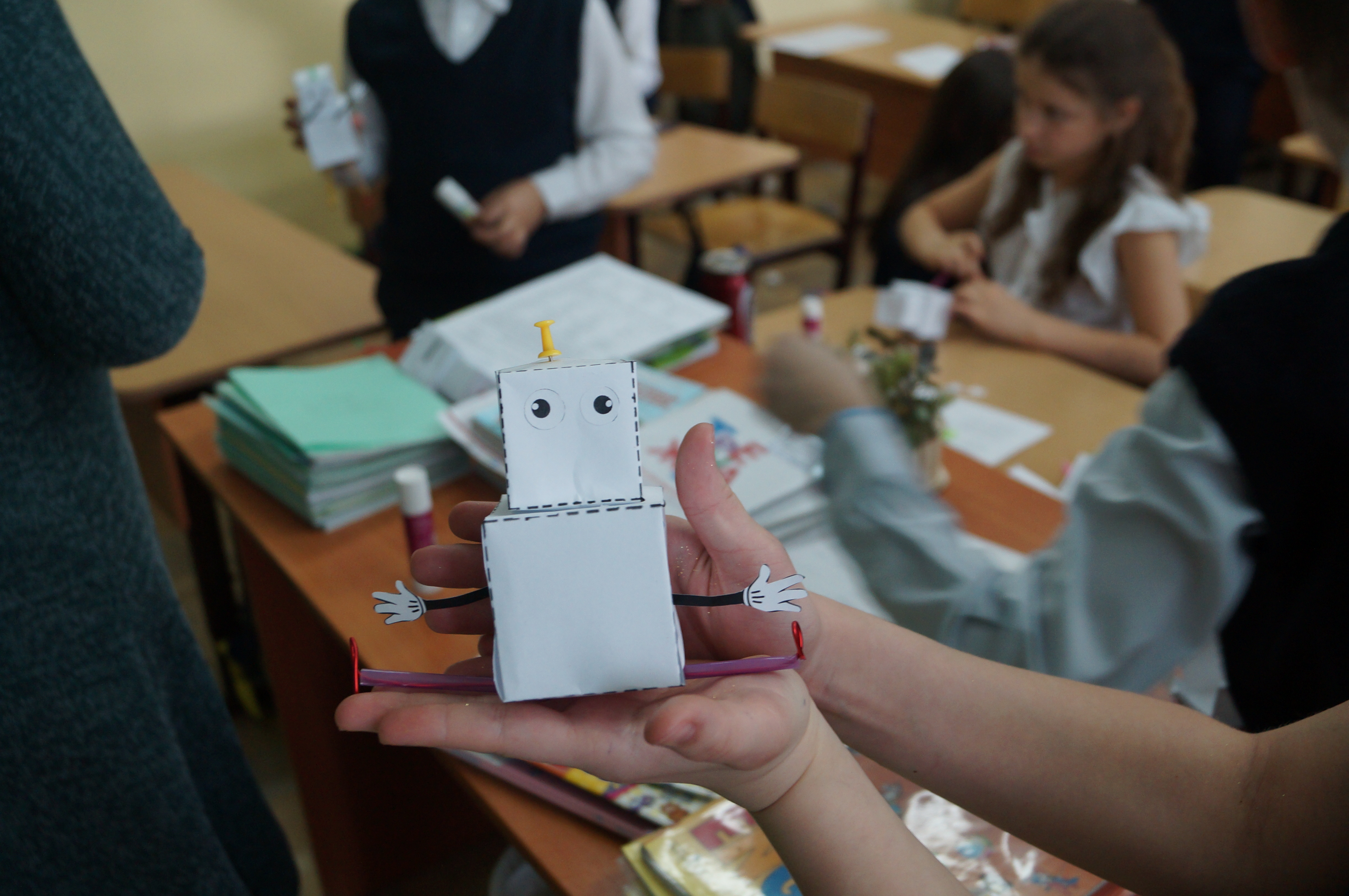 Однажды советский детский писатель, фантаст, журналист и сценарист Евгений Велтистов (1934–1989) отправлялся на отдых. Неся в руке тяжёлый чемодан, он задумался о том, что было бы, если бы в нём были не вещи, а, допустим, электронный мальчик… Так родилась история о мальчике-роботе, с которым и предстояло познакомиться третьеклассникам на очередном библиотечном уроке. В книгу входят две повести: «Электроник – мальчик из чемодана» и «Рэсси – неуловимый друг». Они написаны лёгким языком, благодаря чему хорошо воспринимаются детьми. А самый главный посыл автора заключается в том, что в мире есть дружба, доброта и отзывчивость. В конце занятия дети смастерили своего уникального робота.