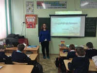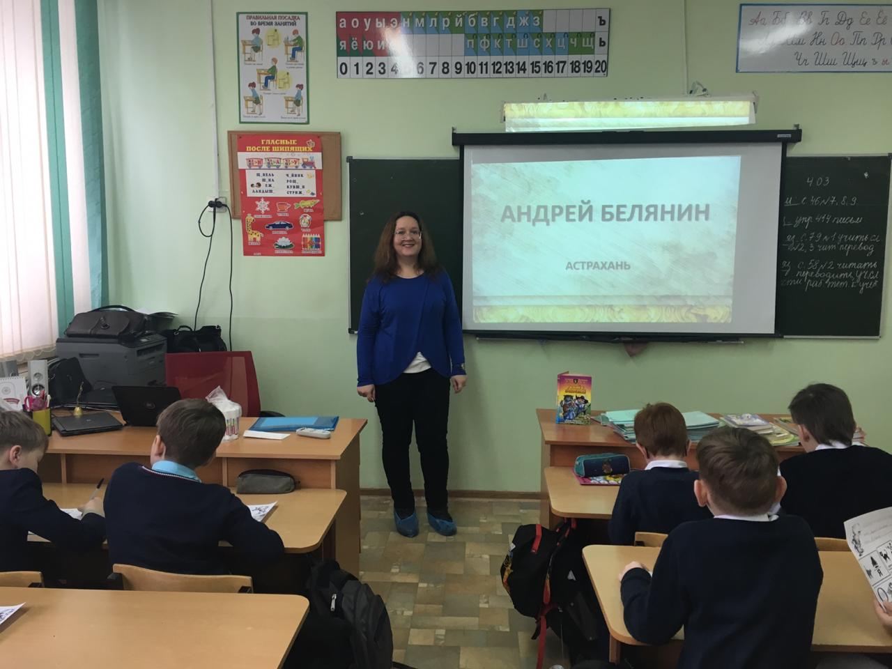 Ученики третьего класса познакомились с творчеством современного российского писателя и поэта, одного из самых тиражных и популярных писателей современной фантастики, признанного мастера юмористического фэнтези, на счету которого более 60 увлекательных и забавных книг, Андрея Белянина (род. 1967). В 2000 году вышла в свет сказочная повесть для детей «Рыжий и полосатый». На уроке дети познакомились с забавными котятами, отправились вместе с ними в увлекательное путешествие, нашли новых друзей и одержали победу над недругами. На занятии ребята прослушали отрывок из аудио спектакля и без затруднений смастерили сказочного героя – котёнка Рыжего.