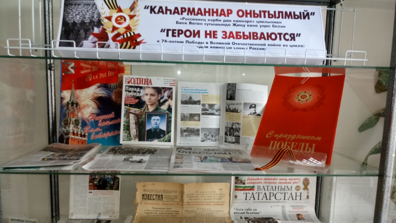 В читальном зале Национальной библиотеки Республики Татарстан (ул. К. Маркса, д. 36) отделом периодических изданий организована выставка «Герои не забываются!», посвящённая 74-й годовщине Победы в Великой Отечественной войне.