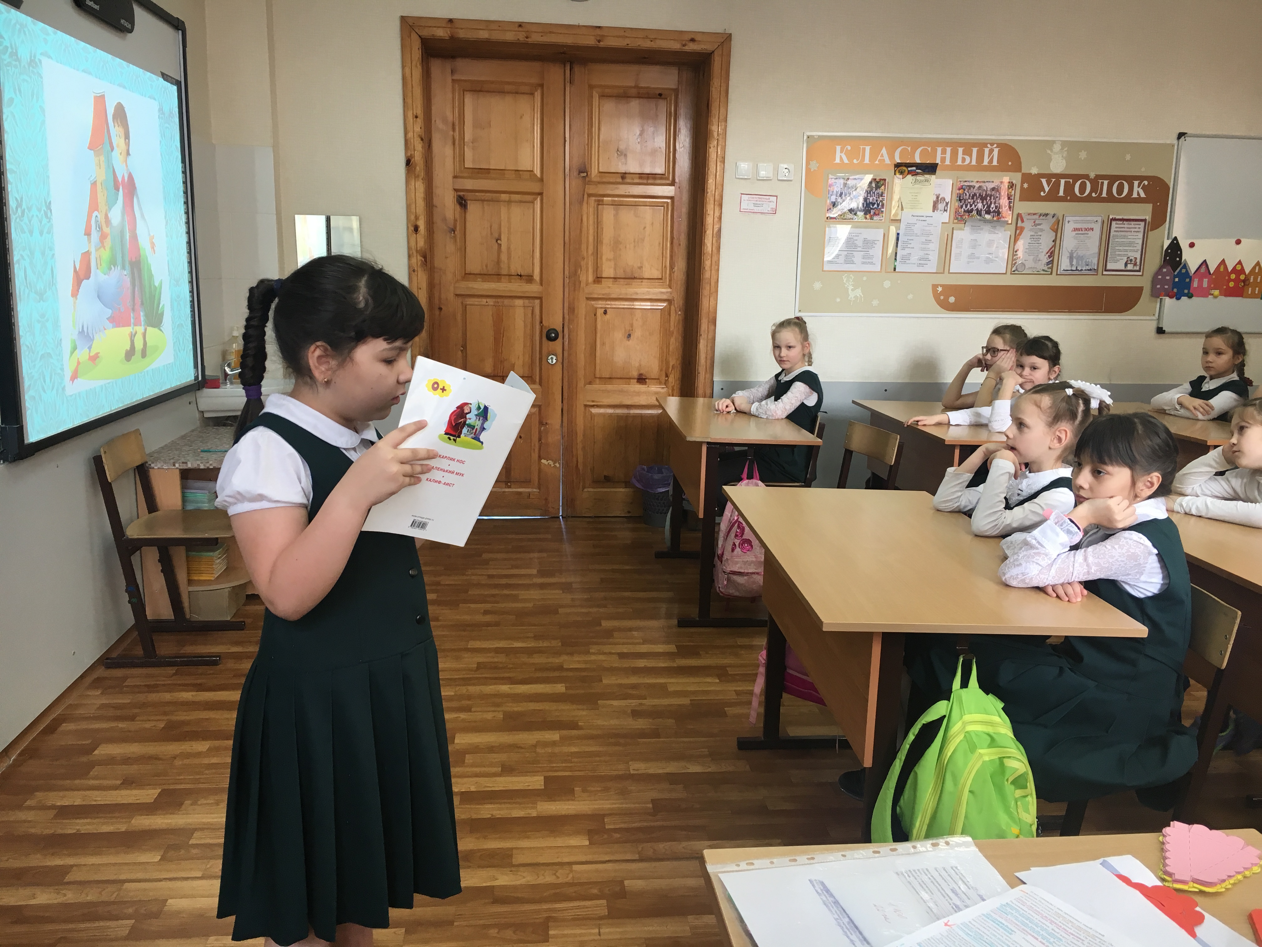 Библиотекари познакомили ребят со сказкой, которая была представлена в форме красочной презентации. Ученики сопереживали главному герою – мальчику Якобу, украденному колдуньей и превращённому ею в карлика с отталкивающей внешностью за насмешки над её уродливым старческим образом. За время долгой службы у колдуньи Якоб освоил много профессий. Он научился так великолепно готовить, что ему не было равных в этом деле. Убежав от злой ведьмы, мальчик пытался вернуться к родителям, но они не узнали своего сына в незнакомом карлике. Мальчик поступил на королевскую службу, где познакомился с заколдованной принцессой Мими. Зародившаяся дружба Якоба и Мими помогла им обоим вырваться из колдовства.