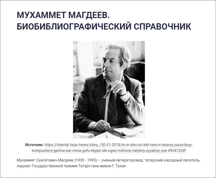 На сайте НБ РТ появился новый электронный персональный справочник, посвященный Мухаммету Сунгатовичу Магдееву (1930 - 1995), татарскому народному писателю, лауреату Государственной премии имени Г. Тукая, ученому-литературоведу.