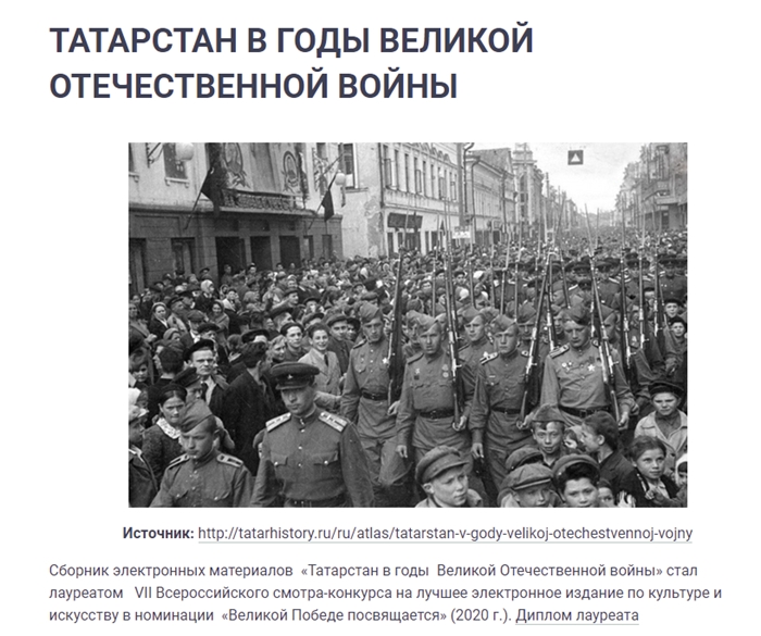 К празднику Великой Победы 9 мая на сайте Национальной библиотеки РТ обновился электронный справочник «Татарстан в годы Великой Отечественной войны». Он дополнился разделом «Дети войны Татарстана о Великой Отечественной войне». Сюда включены информационные источники из фонда НБ РТ о воспоминаниях детей, переживших военное время. Даются ссылки и на источники сети Интернет.