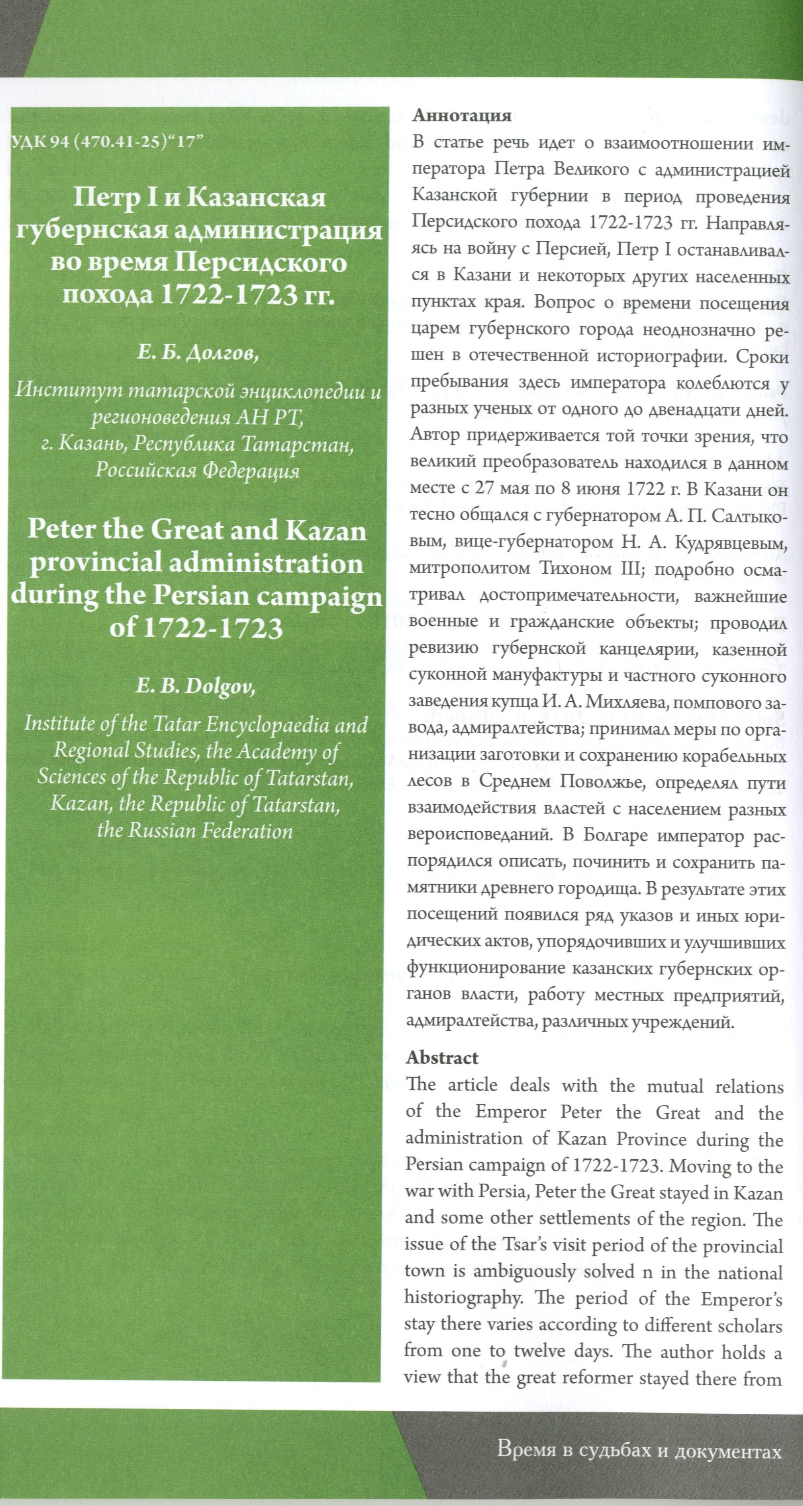 «…Визит великого преобразователя России в Казанский край оказался очень плодотворным. В результате посещения Казани и некоторых других населенных пунктов губернии были приняты указы и иные юридические акты, упорядочившие и улучшившие деятельность губернских органов власти, работу местных предприятий, адмиралтейства, различных учреждений. Освоение сибирских богатств, завоевание Каспия и развитие восточной торговли в дальнейшем благоприятствовало расцвету города Казани…»