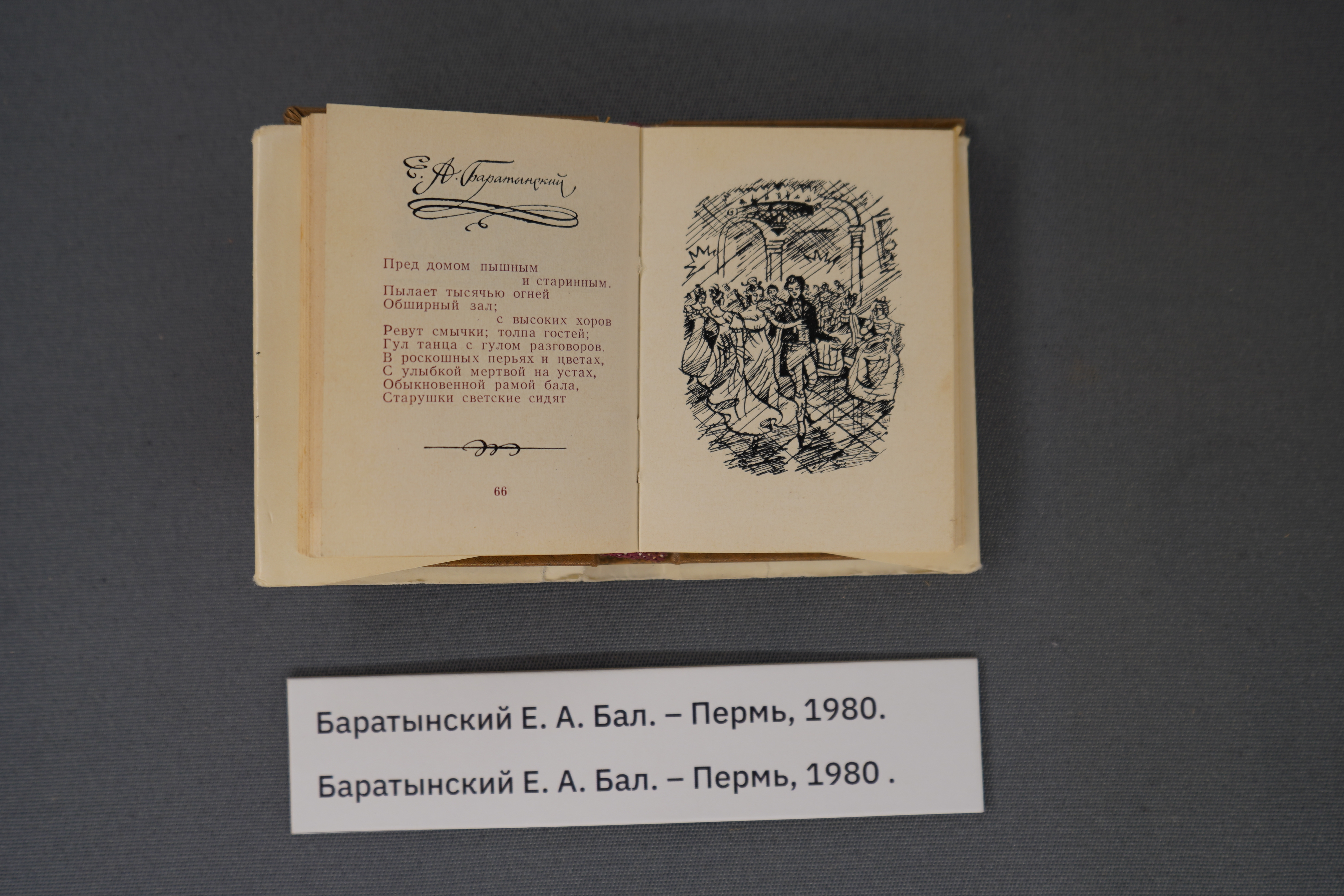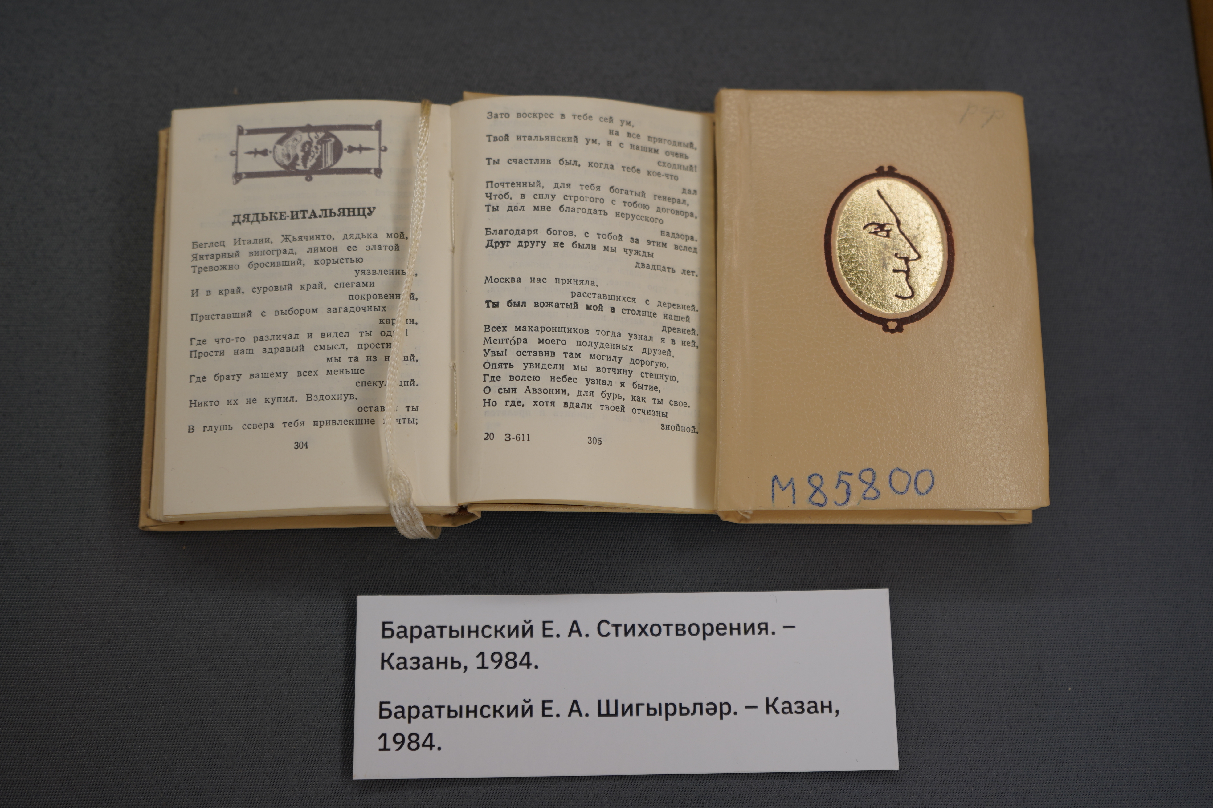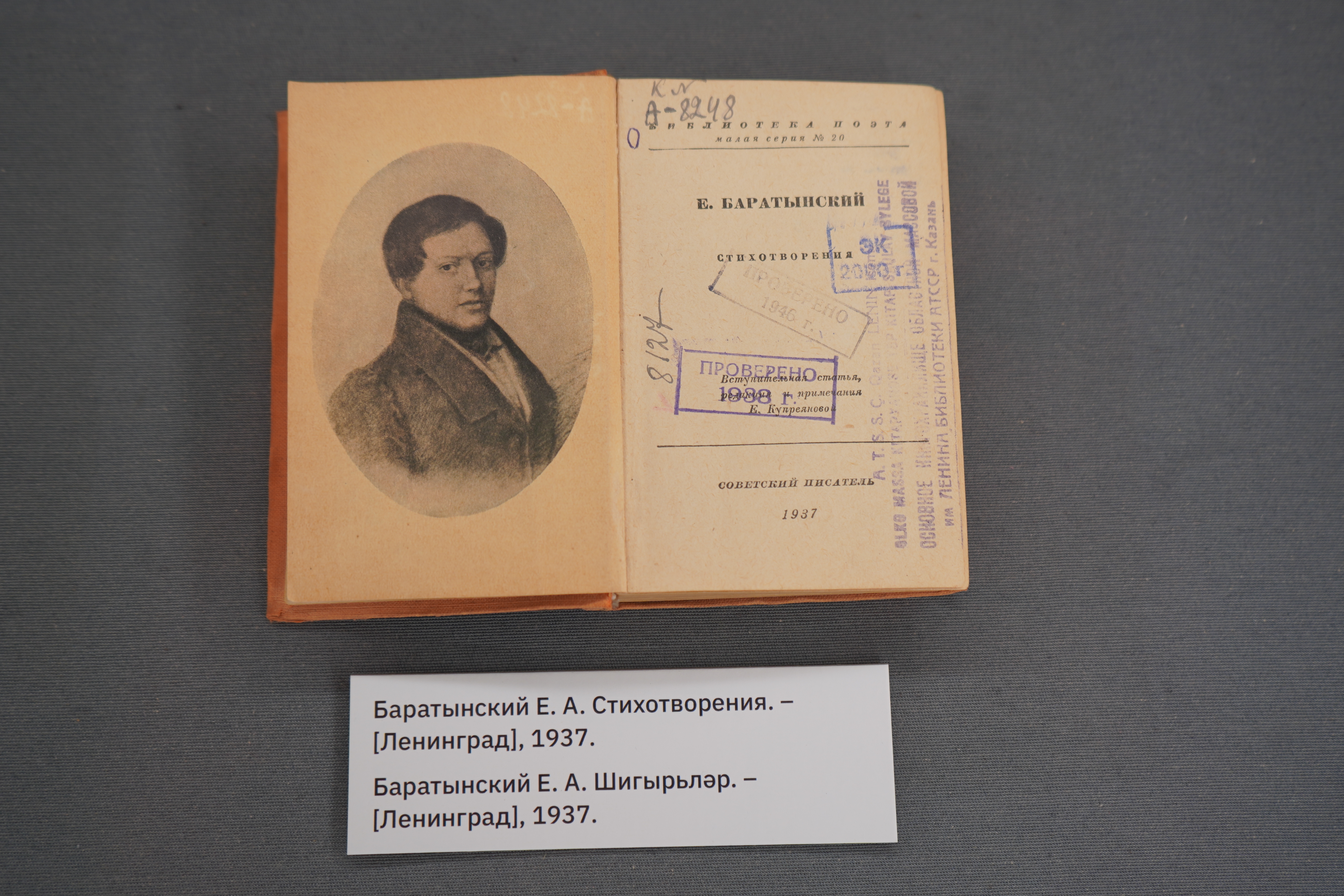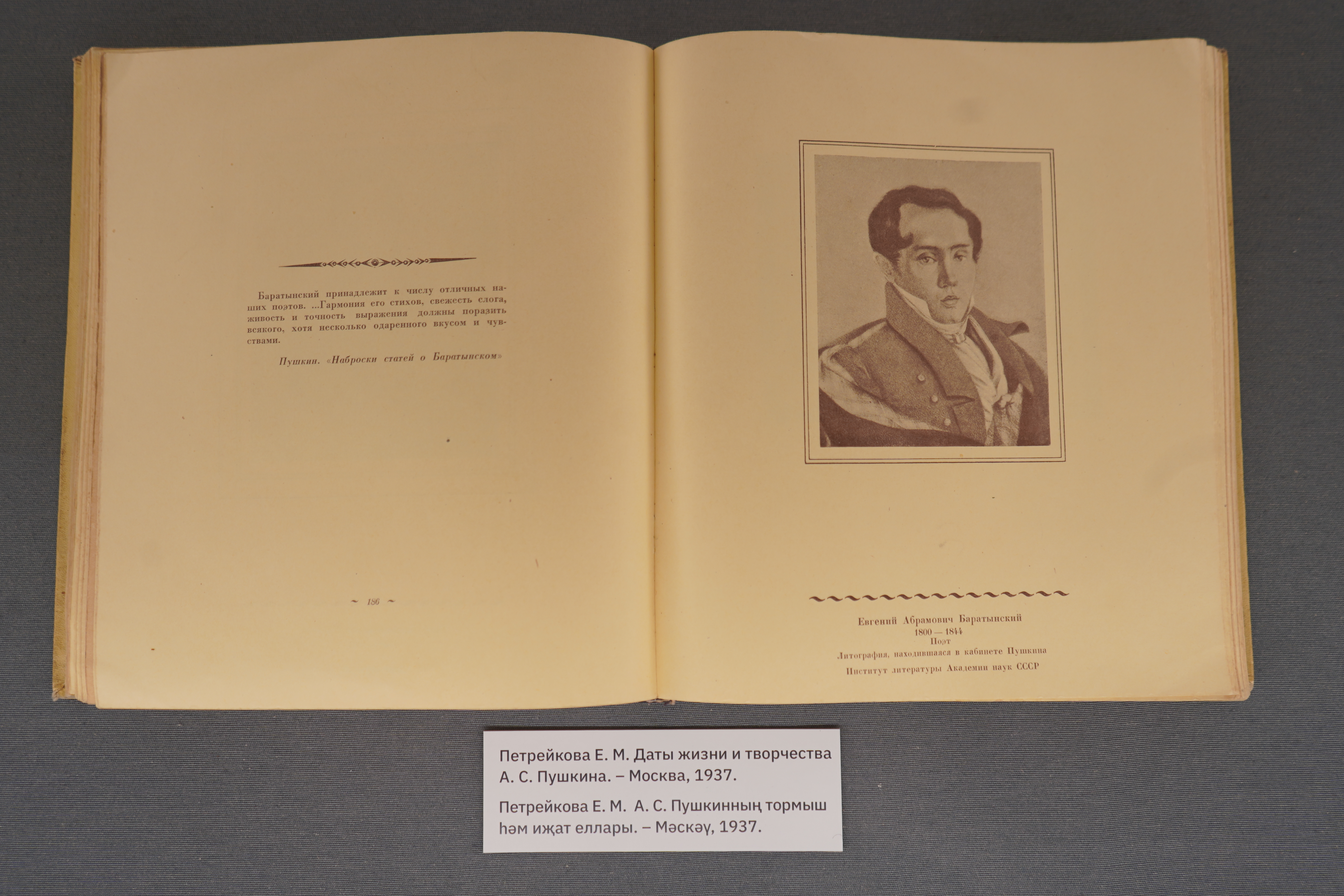 Выставка к 225-летию поэта открылась в классическом зале Национальной библиотеки РТ. Экспозиция представляет поэтические сборники со стихами разных периодов творчества поэта, а также биографические и литературоведческие статьи о Евгении Баратынском.