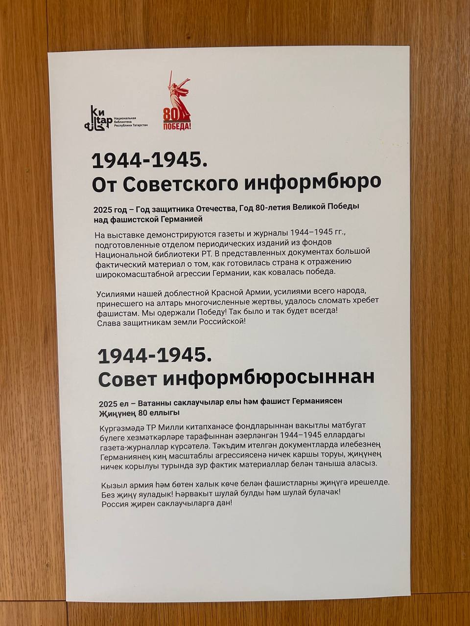 9 мая 2025 года наша страна отпразднует 80-летие Победы в Великой Отечественной войне. К этому знаменательному событию сотрудники отдела татарской и краеведческой литературы организовали в классическом читальном зале три тематические книжные выставки: