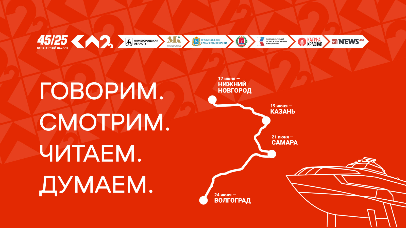Символом «Культурного десанта 45/25» стало легендарное судно на подводных крыльях «Метеор 120Р», оснащенное искусственным интеллектом. На нем участники перемещаются по Волге, останавливаясь в городах маршрута. Столица Республики Татарстан станет второй точкой маршрута проекта. Форумная программа «Говорим. Смотрим. Читаем. Думаем» объединит интеллектуальные и творческие силы современности. Главная цель — переосмысление роли культуры в переломные моменты истории и формирование гуманитарной повестки будущего России.