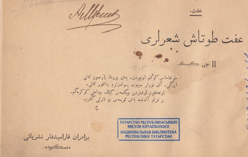 Гыйффәт Туташ. Гыйффәт Туташ шигырьләре. – Мәскәү: Борадарән Карамышевлар нәшрияты, 1915.