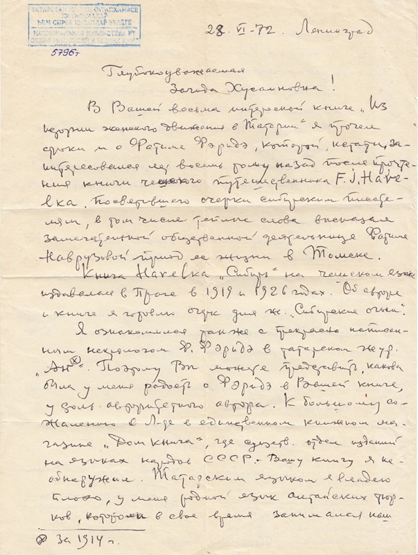 Отзыв этнографа П.И.Каралькина на книгу «Из истории женского движения в Татарии», 1972 год