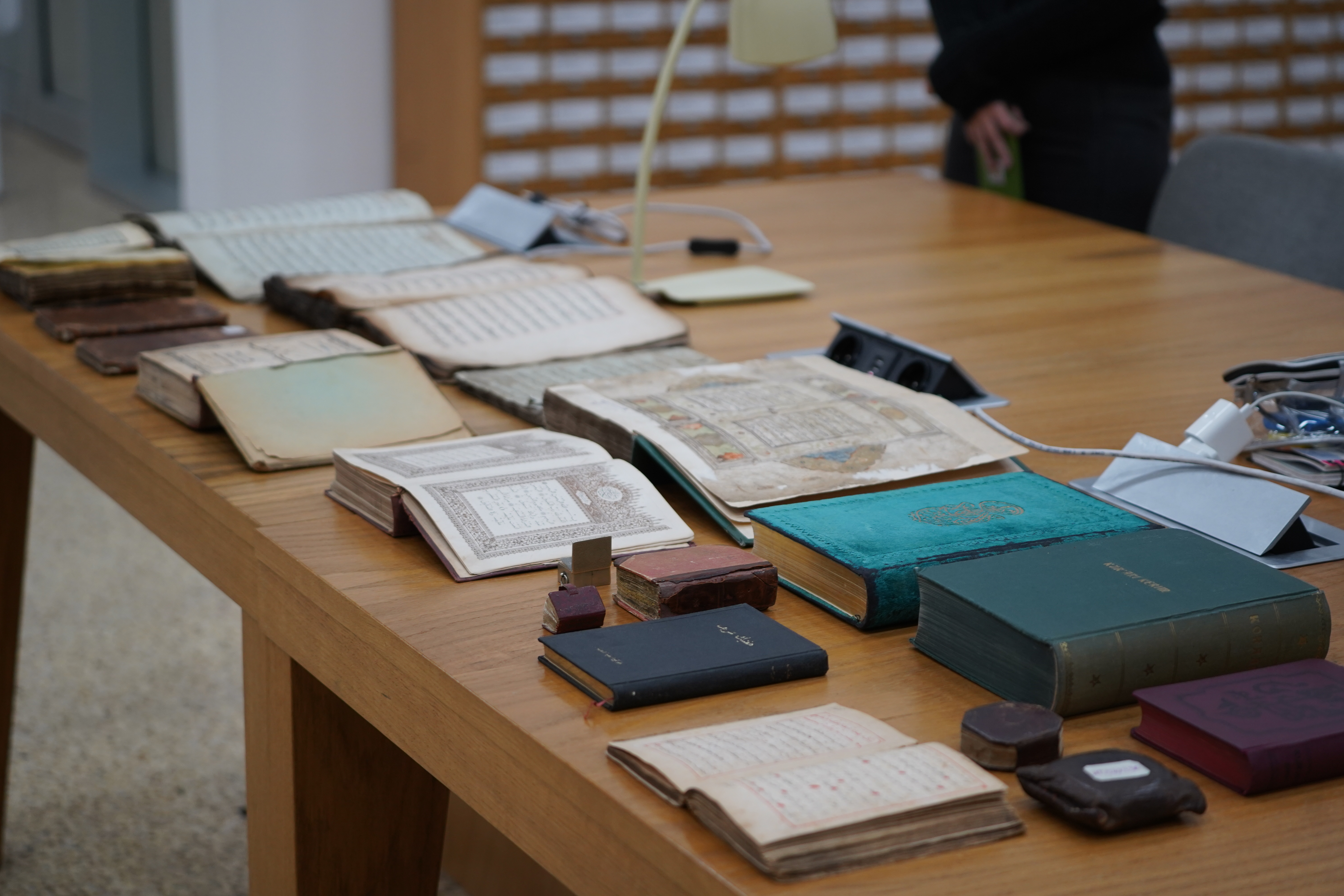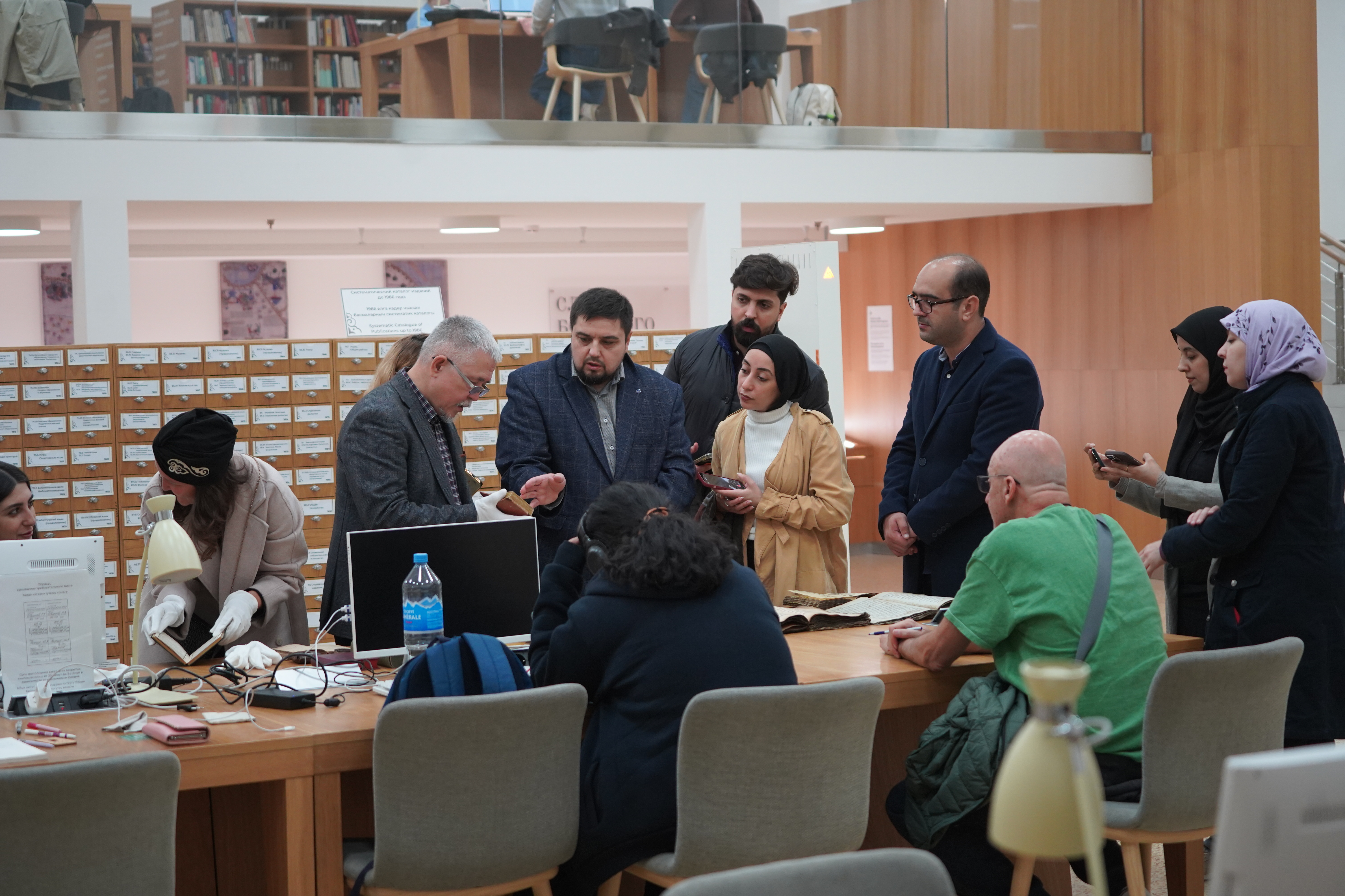 Заведующий отделом рукописей и редких книг Айрат Загидуллин представил иностранным гостям «сокровища» редкого фонда НБ РТ. На сегодня здесь хранится 11 тысяч рукописей на татарском и восточных языках, 25 тысяч печатных изданий на 20 языках народов мира. Отдельная гордость – коллекция коранов (более 400 изданий). Самый редкий экземпляр датируется 1804 годом. Также в редком фонде бережно хранится миниатюрное османское издание конца 19 века и миниатюрная литография конца 19 века, изданная в Кашмире.