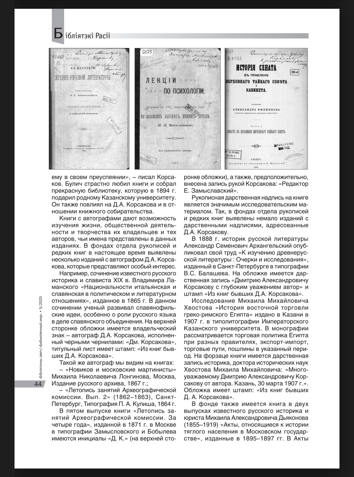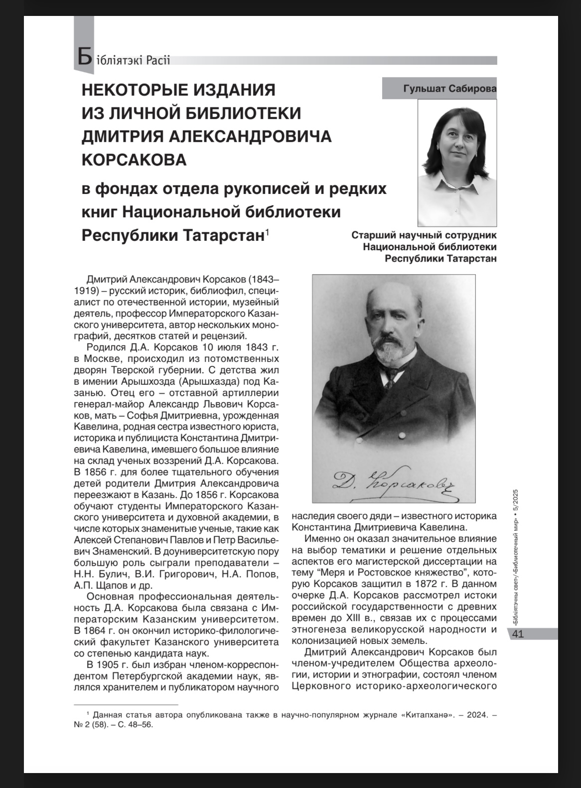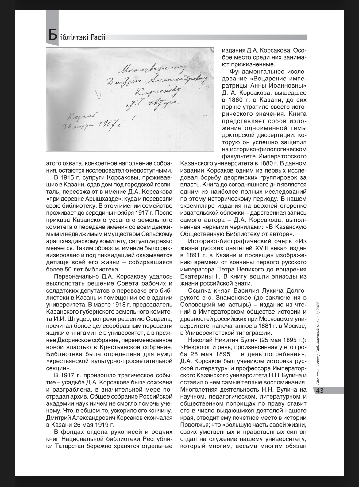 Материал посвящен русскому историку, библиофилу, специалисту по отечественной истории, музейному деятелю, профессору Императорского Казанского университета, автору нескольких крупных монографий, десятков статей и рецензий Дмитрию Александровичу Корсакову (1843-1919). В работе описываются издания Д. А. Корсакова из фондов отдела рукописей и редких книг, приводятся некоторые сведения о его личной библиотеке.
