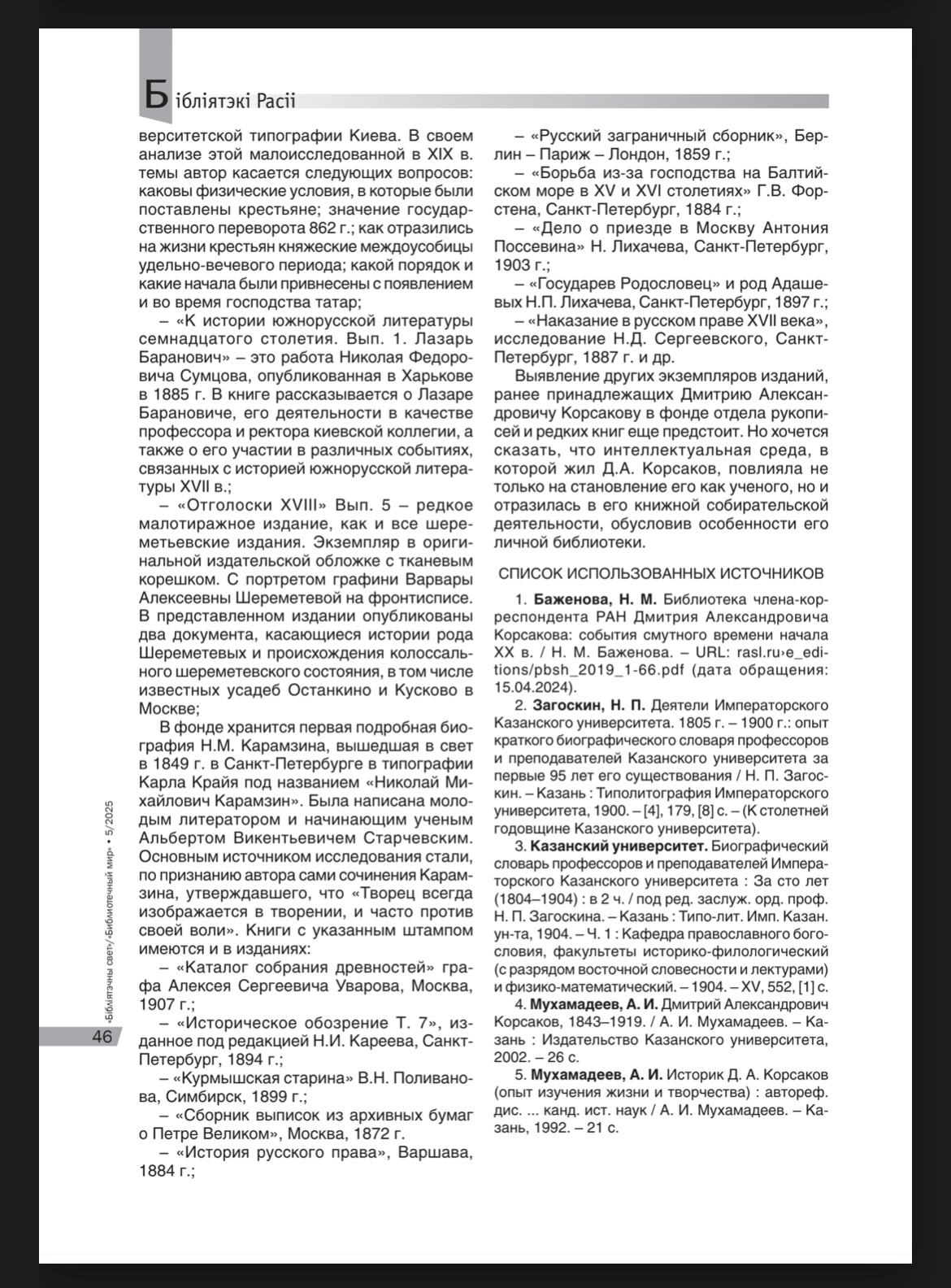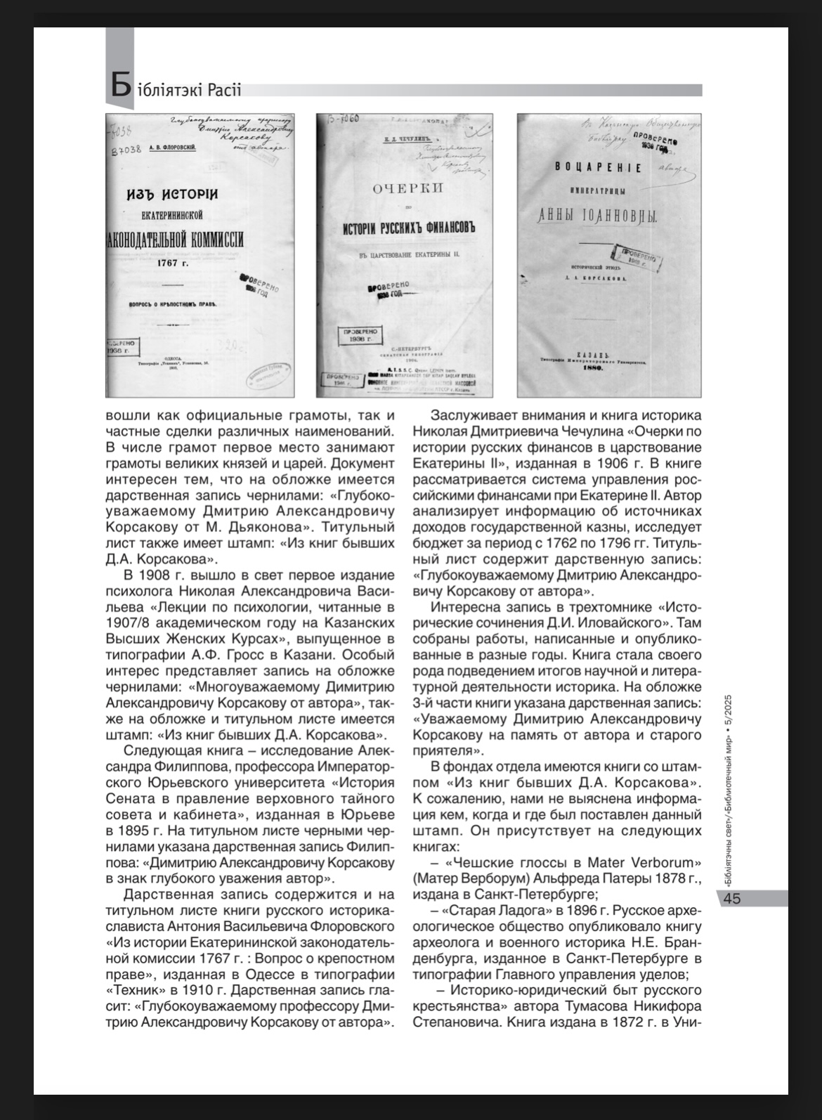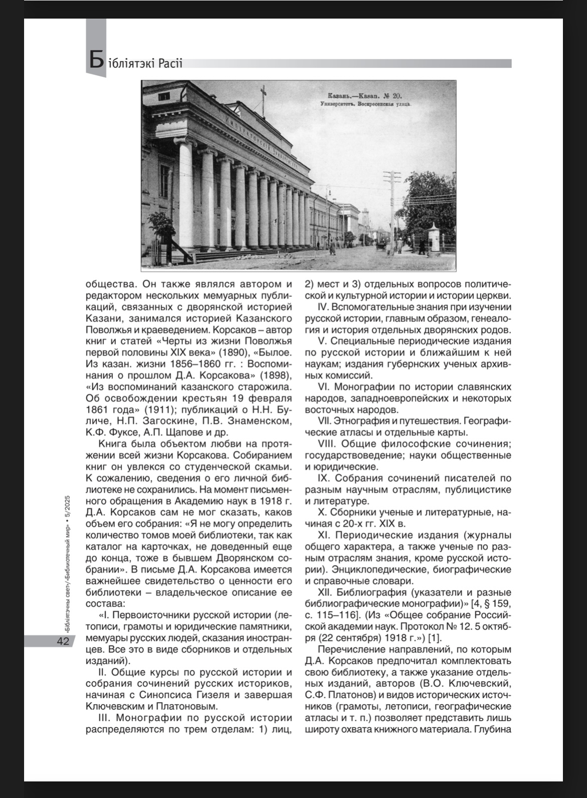 Материал посвящен русскому историку, библиофилу, специалисту по отечественной истории, музейному деятелю, профессору Императорского Казанского университета, автору нескольких крупных монографий, десятков статей и рецензий Дмитрию Александровичу Корсакову (1843-1919). В работе описываются издания Д. А. Корсакова из фондов отдела рукописей и редких книг, приводятся некоторые сведения о его личной библиотеке.
