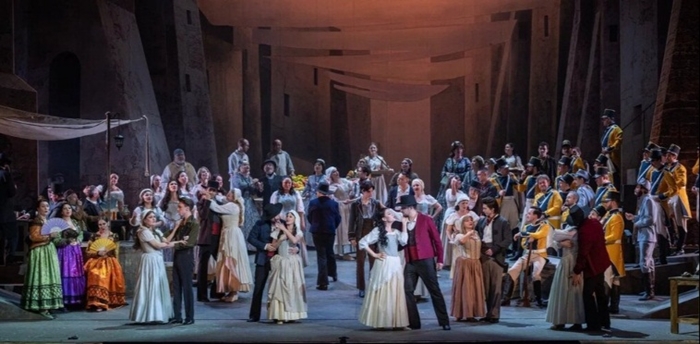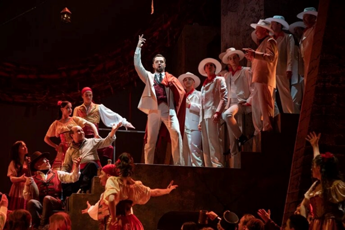 В самой массовой сцене спектакля в таверне одновременно были заняты 132 артиста! Персонажи танцевали (в исполнении казанской труппы) и разыгрывали мизансцены. Сценография выполнена Итало Грасси так, что зритель чувствует полуденный зной на рыночной площади, прохладу горного леса, горизонт узкого ущелья. В конце отчетливо воспринимается трагизм развязки – смерть Кармен от руки Хозе.