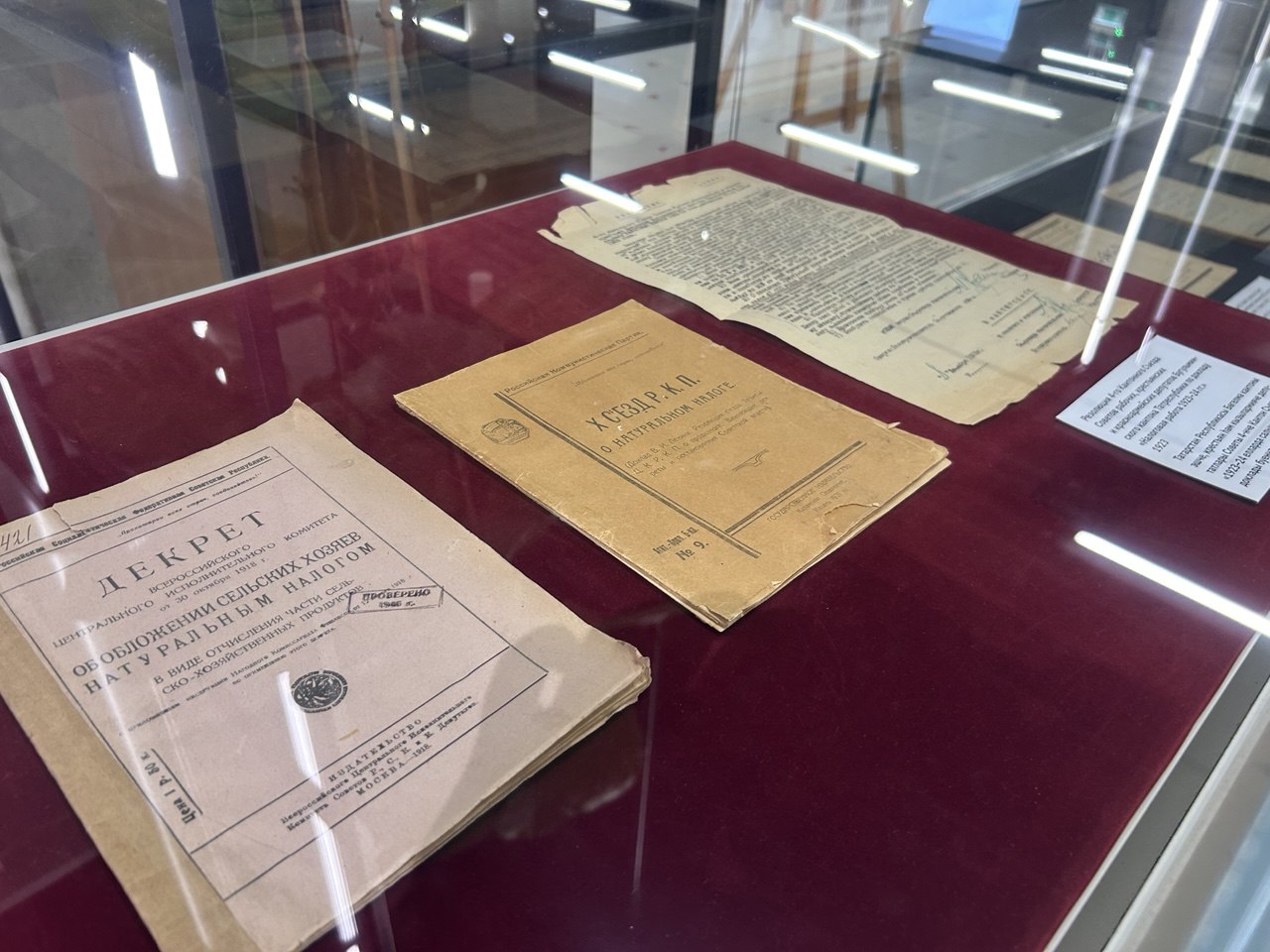 Также на экспозиции представлены книги и документы второй половины XIX века – податные реестры, отчёты по налогам Казанского уезда, документы купли-продажи, том Свода законов Российской империи, посвящённый пошлинам и акцизным сборам, книги о налоговых системах в России, а также издание о том, как в нашей стране обсуждалось введение налога на собак.