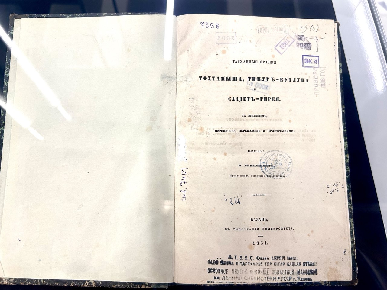 Среди них – издание 1851 года казанского ученого Николая Березина, посвященное текстам Золотоордынского периода. Труд, под названием «Тарханные ярлыки Тохтамыша, Тимур-Кутлука и Саадет-Гирея» содержит оригинальные тексты (на тюркском, старо-татарском языках) и их перевод на русский язык.