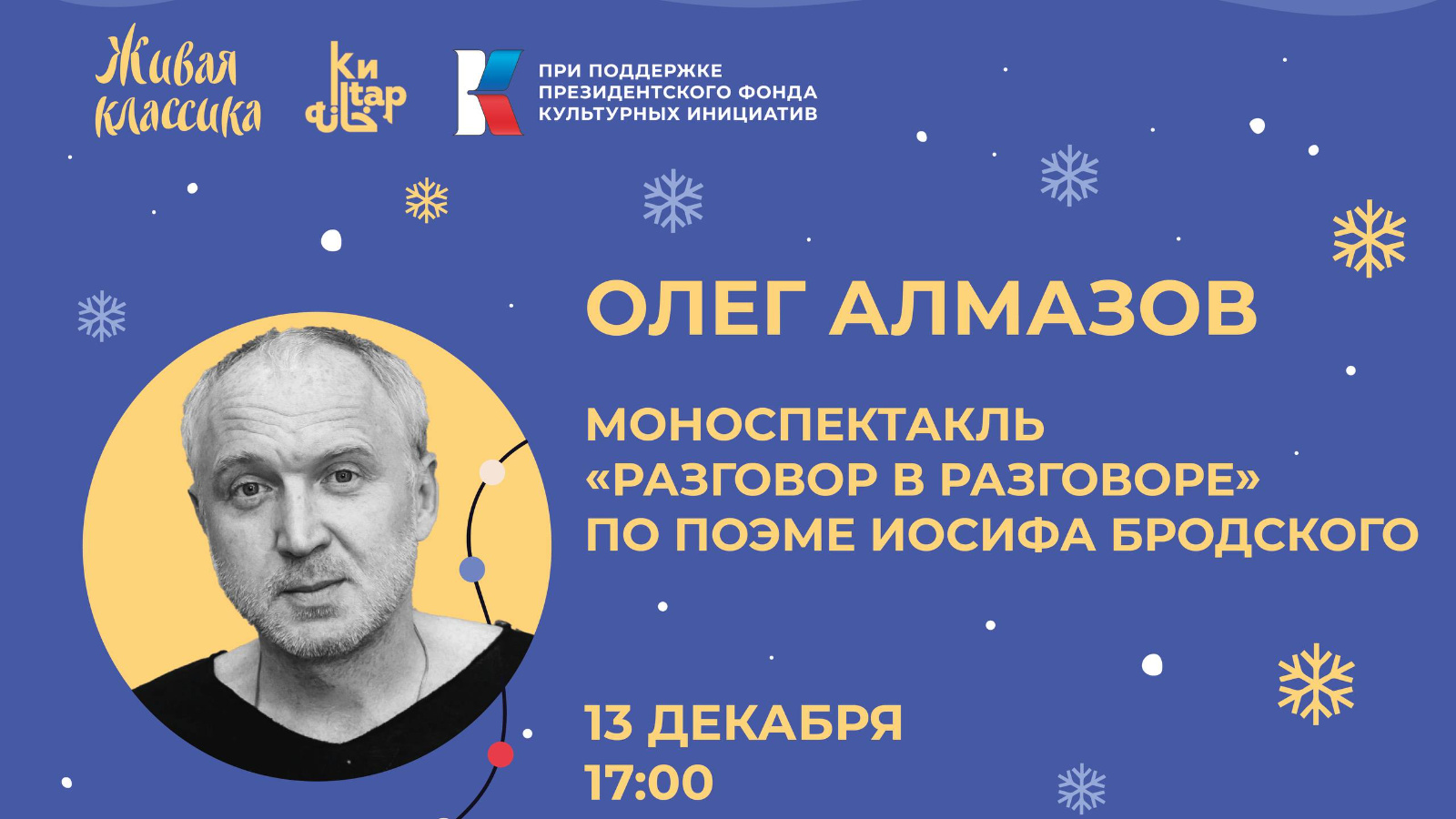 В рамках всероссийской акции, 13 декабря в 17.00, он представит моноспектакль «Разговор в разговоре» по поэме Иосифа Бродского «Горбунов и Горчаков». Два персонажа в этом спектакле олицетворяют противоположные начала человеческого существа — разум и интуицию, логику и творчество.