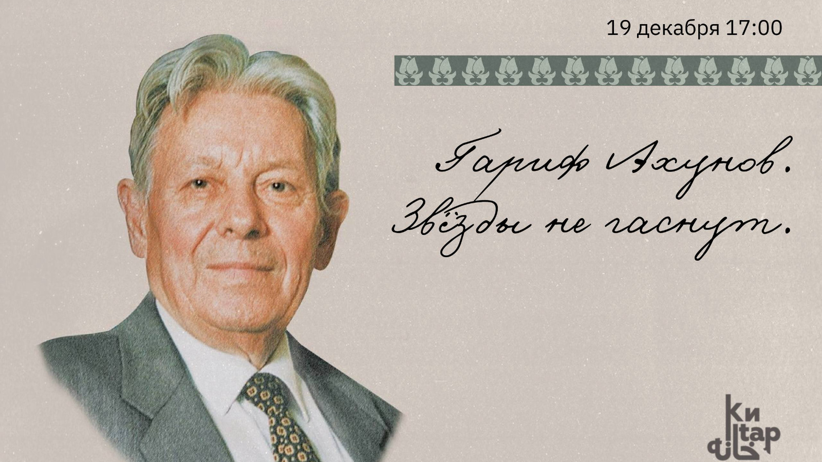 19 декабря в 17:00 в выставочном зале Национальной библиотеке РТ пройдёт творческий вечер, посвящённый народному писателю Республики Татарстан, общественному деятелю, почетному члену АН РТ Гарифу Ахунову.
