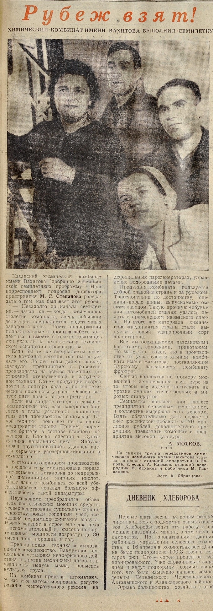 «Незадолго до начала семилетки, когда отмечалось столетие комбината, здесь побывала делегация специалистов родственных заводов страны. Гости подчеркнули положительные стороны в работе коллектива и вместе с тем по-товарищески указали на недостатки в техническом оснащении производства.