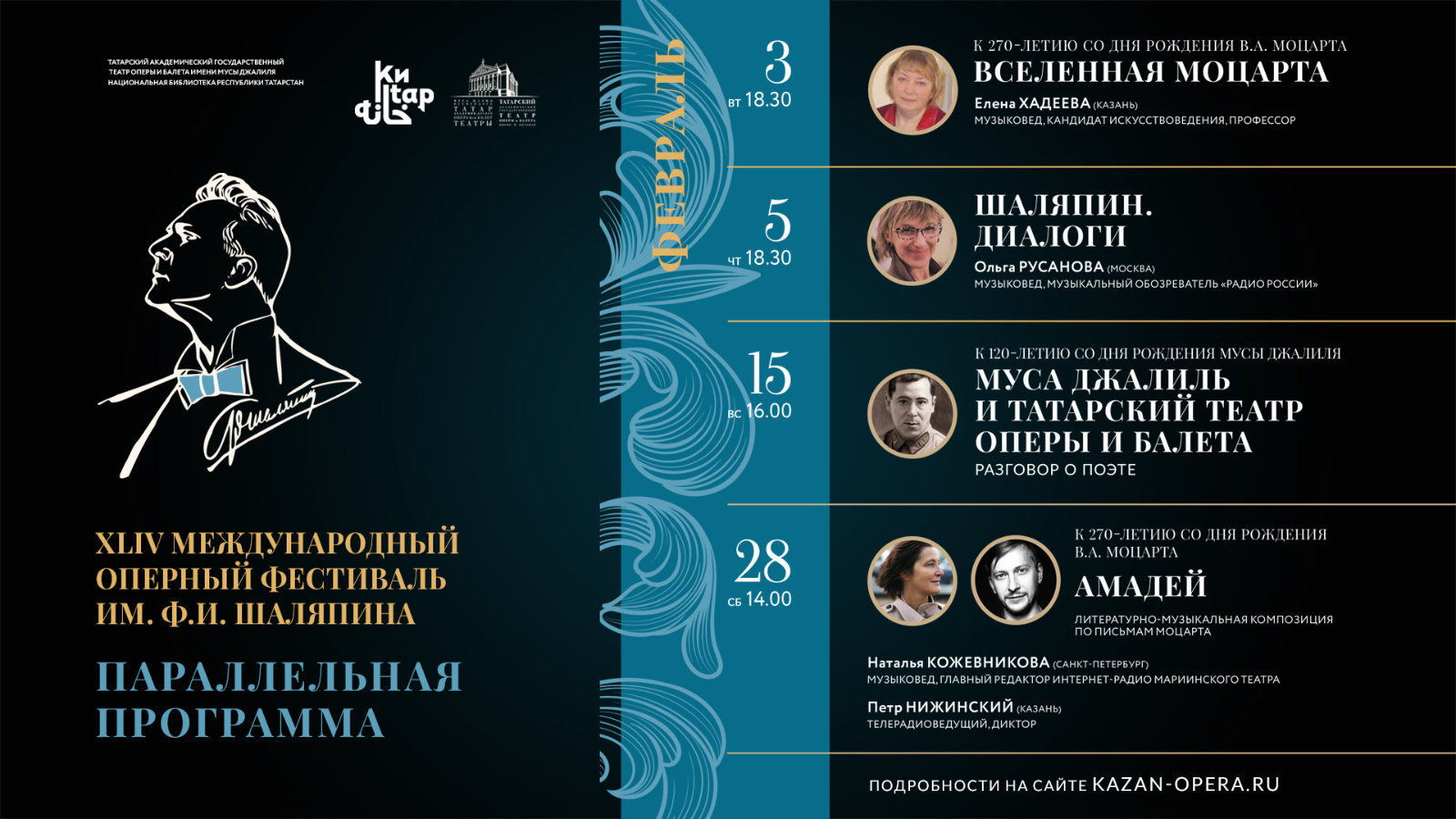 Фёдора Шаляпина всегда окружали самые яркие представители культуры и искусства. Его близкими друзьями были писатель Максим Горький, композитор Сергей Рахманинов, художники Константин Коровин и Михаил Врубель, меценат Савва Мамонтов, актер Мамонт Дальский и многие другие. Опираясь на письма и воспоминания современников Шаляпина, музыковед (г. Москва) и музыкальный музыкальный обозреватель «Радио России» Ольга Русанова подготовила уникальную лекцию, которая раскроет личность великого русского баса с новой стороны и погрузит в атмосферу ушедшей эпохи, в которой жил и творил Ф.И. Шаляпин.15.02 Открытый разговор | «Муса Джалиль и Татарский театр оперы и балета» (12+), конференц-зал