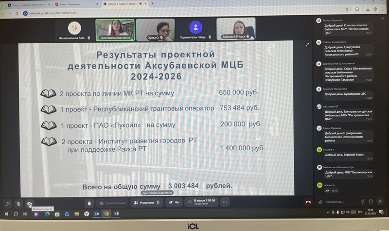 27 марта 2026 года, в рамках проекта научно-методического отдела Национальной библиотеки Республики Татарстан «Методисты онлайн», состоялся очередной семинар для специалистов муниципальных библиотек Республики Татарстан «Проектная деятельность: разработка и реализация библиотечных проектов».