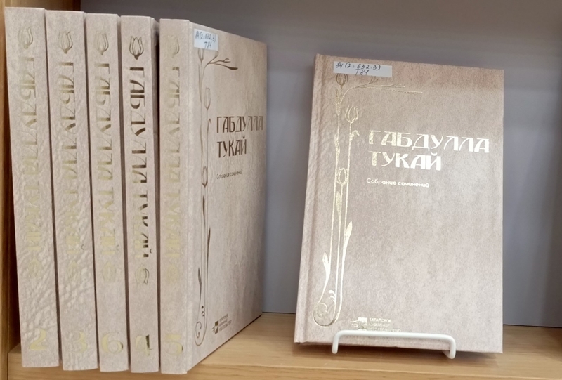 Среди многочисленных книг Г.Тукая на татарском языке в наших фондах имеются прижизненные издания поэта; трёхтомное собрание сочинений, изданное в 1929–1931 гг.; академическое издание в 2-х томах (1943, 1948 гг.); четырёхтомное (1975–1976 гг.); пятитомное (1985–1986 гг.) собрания сочинений; академический шеститомник (2011–2016); большое количество сборников избранных стихотворений и сборников стихотворений и сказок для детей.
