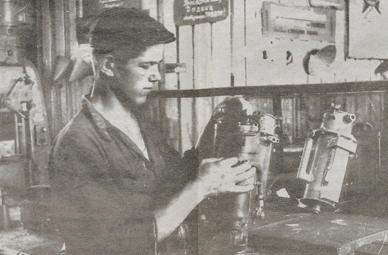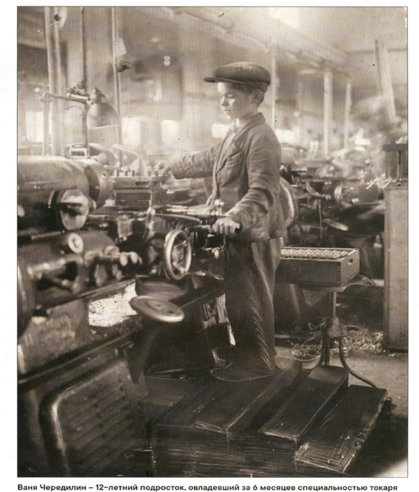 За станком на заводе имени А. М. Горького16 летний Виктор Паршин, награжденный медалями «За доблестный труд в Великой Отечественной войне».