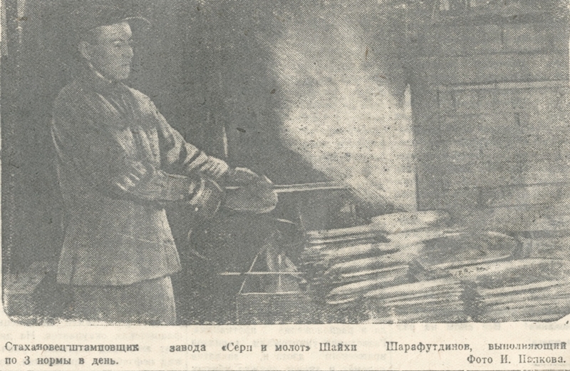 «Выполняя сложные фронтовые заказы, стахановцы трудятся за двоих и троих, и когда требуется по нескольку суток не покидают цехи. Особенно высокие образцы самоотверженности показывают токарь т. Антонов, клепальщица т. Бедникова, жестянщик т. Бочаров, конструктор т. Козлов, кузнец т. Королев, старший мастер т. Пчелин, жестянщица т. Гатауллина, револьверщица т. Ханова, слесарь т. Яруллин и др.» [18].