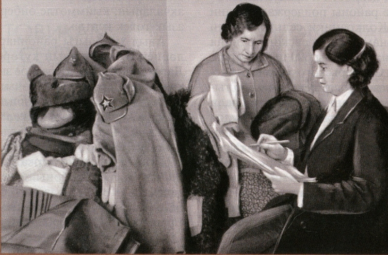 Сбор тёплых вещей бойцам Красной Армии коллективом кетгутного завода. 1941 год.