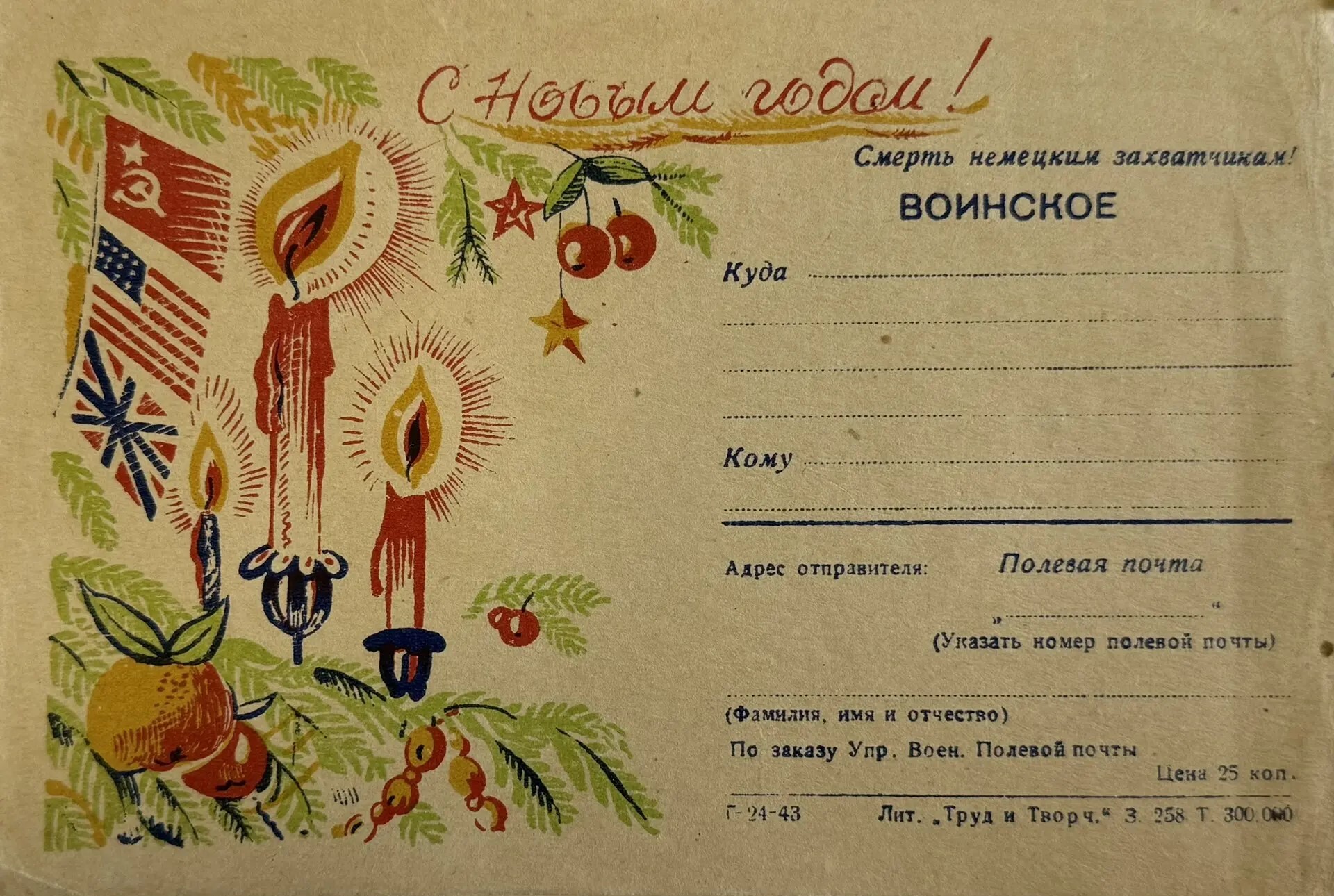К Новому году 1943, 1944 и особенно 1945 года издавались массовые тиражи, призванные укрепить веру в скорую победу. Все письма и почтовые карточки, отправляемые из действующей армии, были бесплатными и не требовали марок.