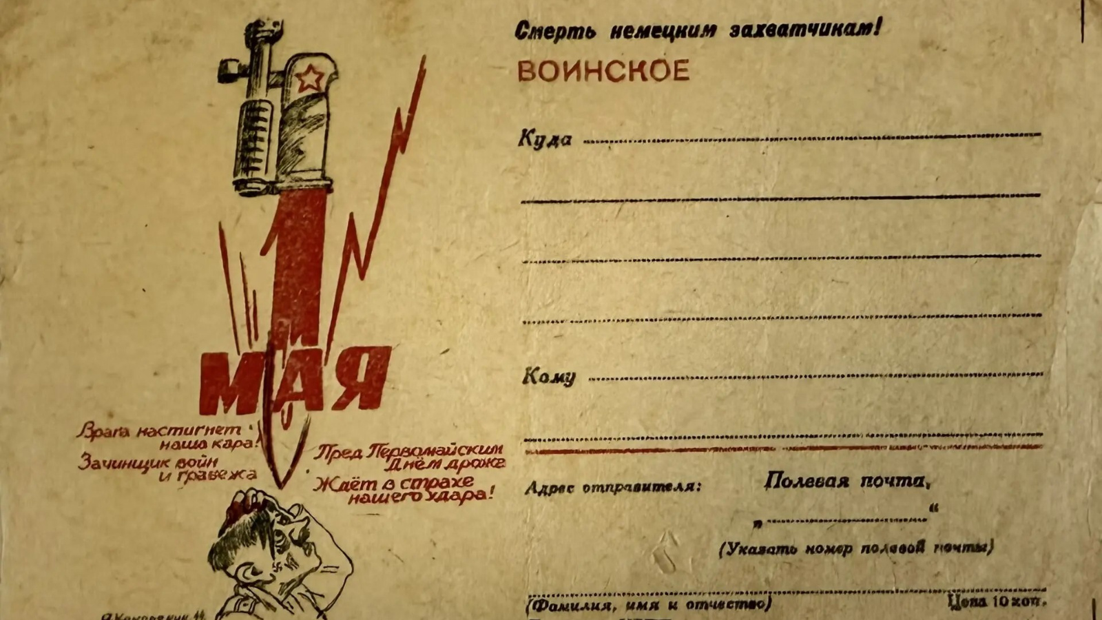 Первые два артефакта – специальные почтовые бланки, оформленные к праздникам: 1 мая и Новому году. Во время Великой Отечественной войны их выдавали солдатам помимо обычных писем-треугольников, что было частью идеологической работы и способом поддержания связи между фронтом и тылом. Бланки были с графическими изображениями бойцов Красной Армии, сценами борьбы, или изображениями счастливой мирной жизни. К 1 Мая 1942–1945 годов выпускались и специальные открытки, призывающие к разгрому врага.