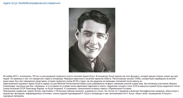 На сайте НБ РТ появился новый электронный справочник «Адель Кутуй». Он подготовлен к 110 -летию со дня рождения выдающегося татарского поэта , писателя, драматурга. Справочник стоит из 7 разделов и включает биографические сведения, обзор жизни и творчества, фотоархив, информационные источники: списки изданий произведений А. Кутуя и литературы о нем, воспоминания об А. Кутуе, обзор статей о писателе и сценарные материалы.