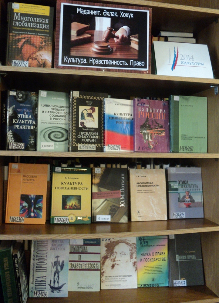 2014 год объявлен в России Годом культуры. В соответствующем указе, подписанном Президентом страны Владимиром Путиным, говорится, что целью акции является "привлечение внимания общества к вопросам развития культуры, сохранения культурно-исторического наследия и роли российской культуры во всём мире". В этой связи в отделе обслуживания пользователей Библиотеки проводится цикл тематических выставок по некоторым аспектам такого всеобъемлющего понятия, как культура: «Культура. Нравственность. Право», «Коммуникация и культурные ценности», «Национальные традиции в культуре народов Поволжья».