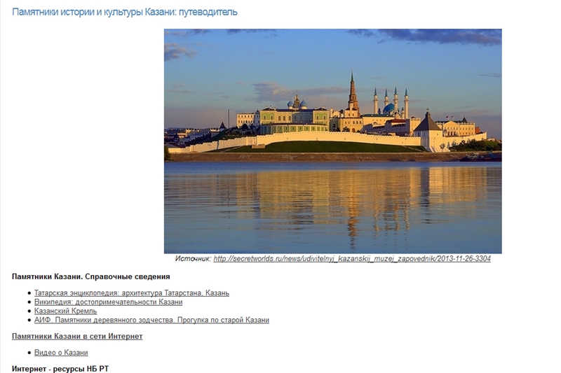 На сайте НБ РТ появился новый справочник-путеводитель «Памятники истории и культуры Казани» на русском и татарском языках. В основном, здесь представлены наиболее значимые ресурсы сети Интернет, посвященные памятникам города, в том числе, видео материалы.