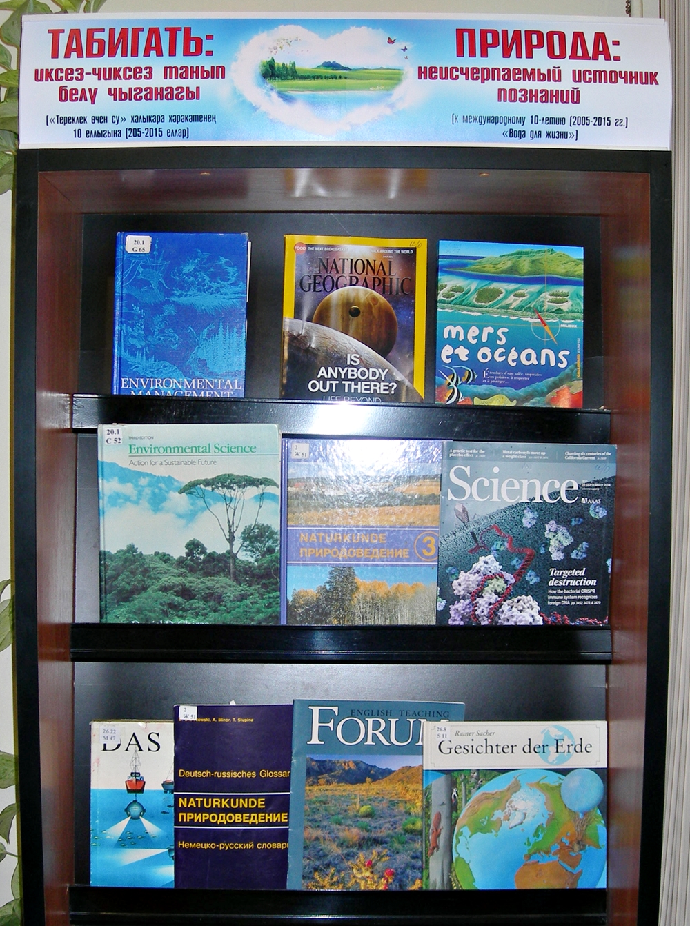 В отделе литературы на иностранных языках Национальной библиотеки Татарстана (ул. Кремлёвская, д. 36) представлена выставка «Природа: неисчерпаемый источник познаний», посвящённая Международному десятилетию действий «Вода для жизни» (2005-2015 гг.).