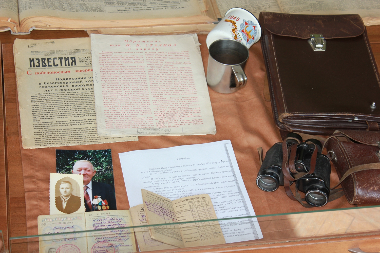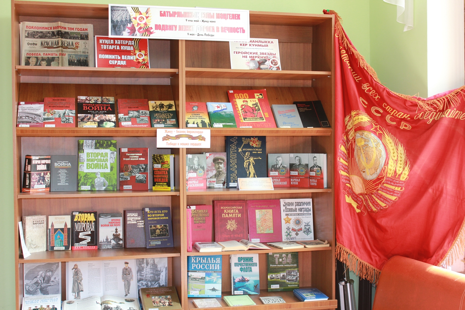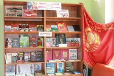 Свой вклад в организацию экспозиции внесли и сотрудники Библиотеки, обогатившие выставку своими семейными реликвиями, среди которых старый патефон, Красное Знамя, фотографии военных лет, личные документы родственников.