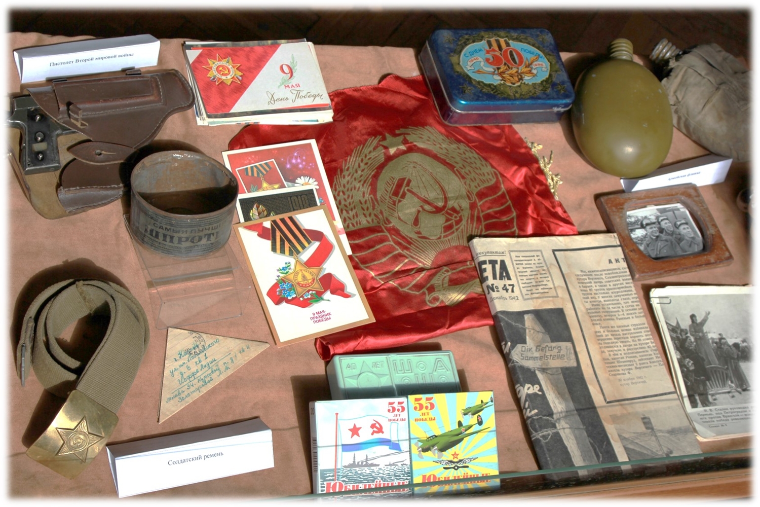 Эмоциональному восприятию экспозиции способствуют и предметы быта тех лет, любезно предоставленные Библиотеке Музеем социалистического быта. Среди экспонатов музея – подлинные реликвии войны: письма-треугольники с фронта, солдатская фляжка, пистолет времён Второй мировой войны, военные сапоги, шкатулки, агитационные плакаты и другие интересные вещи, доносящие до нас свидетельства очевидцев и участников военных действий.
