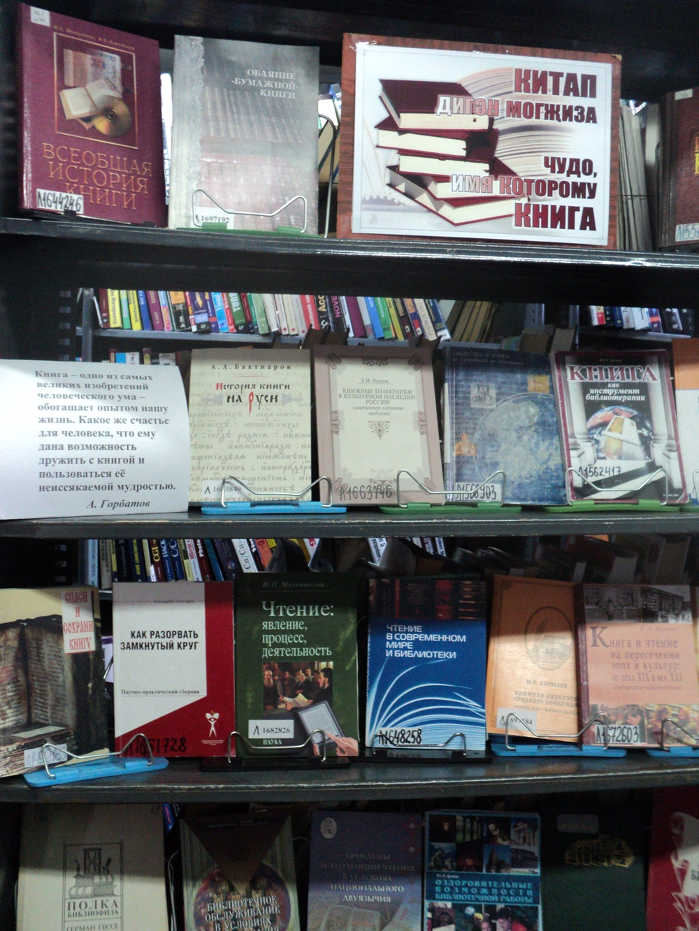 Предложенные на выставке издания знакомят с историей книги, начиная с момента её зарождения до сегодняшнего дня. Здесь же представлены документы о книге как особом виде искусства и способе общения людей, о книжных памятниках в культурном наследии России. Интересны издания, научно обосновывающие пользу чтения и рассказывающие о чтении как явлении, процессе и виде деятельности. Также представлены издания, поднимающие проблемы сохранения книжных фондов страны, повышения роли библиотек, что в конечном счёте является показателем духовно-нравственного состояния общества.