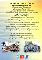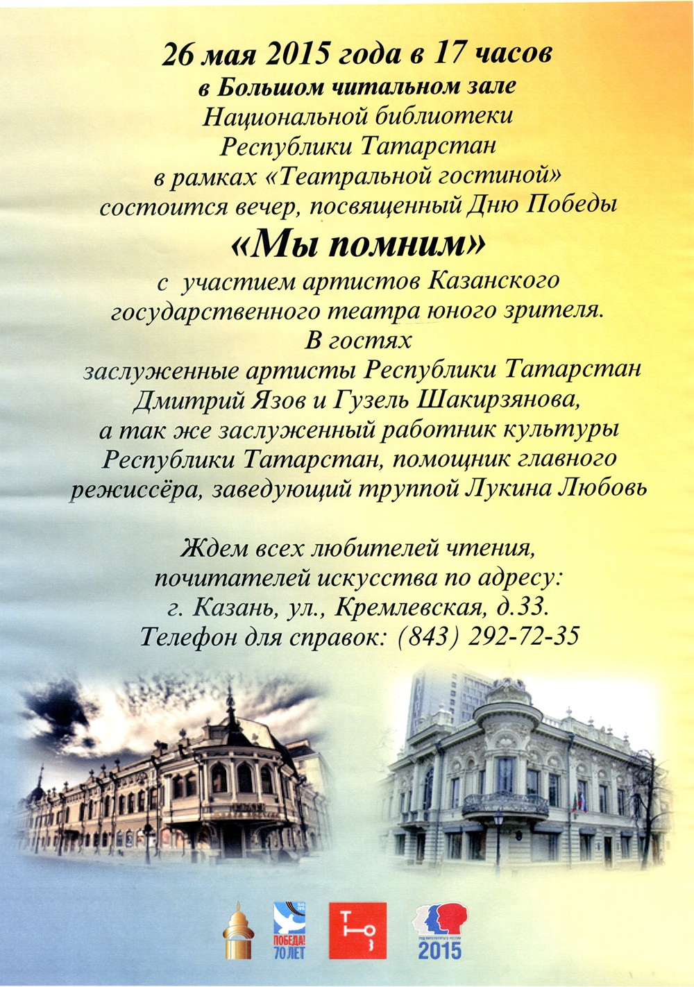 26 мая 2015 года в 17 часов в Большом читальном зале Национальной библиотеки Татарстана (ул. Кремлёвская, д. 33) в рамках Театральной гостиной состоится встреча с артистами Казанского государственного театра юного зрителя «Мы помним», посвящённая Дню Победы.