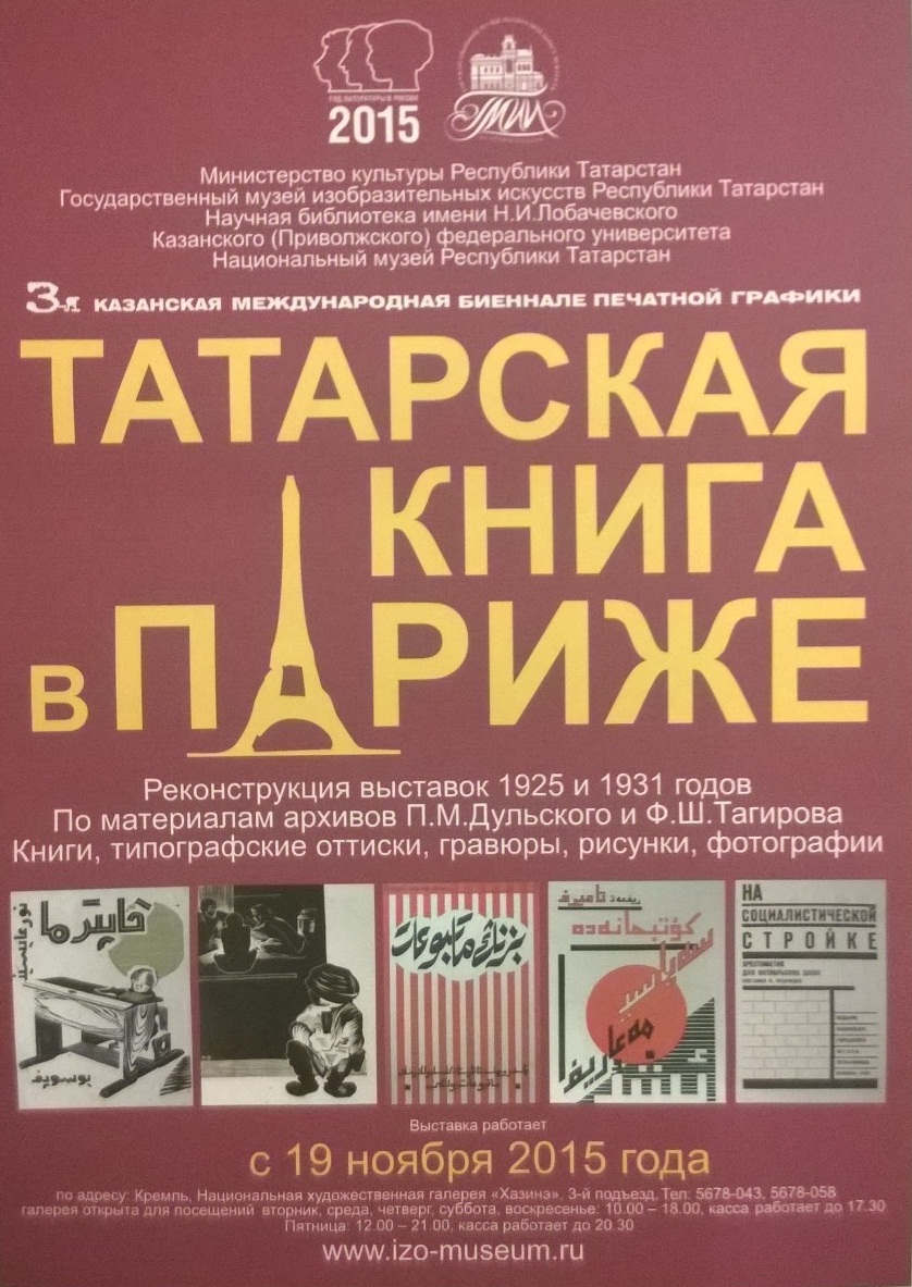 25 ноября 2015 года сотрудники Национальной библиотеки РТ посетили экспозицию «Татарская книга в Париже. Реконструкции выставок 1925 и 1931 годов», которая работает в Национальной художественной галерее «Хазинэ» в рамках проведения III Международной биеннале печатной графики «ВСАДНИК», посвященная Году литературы в России.