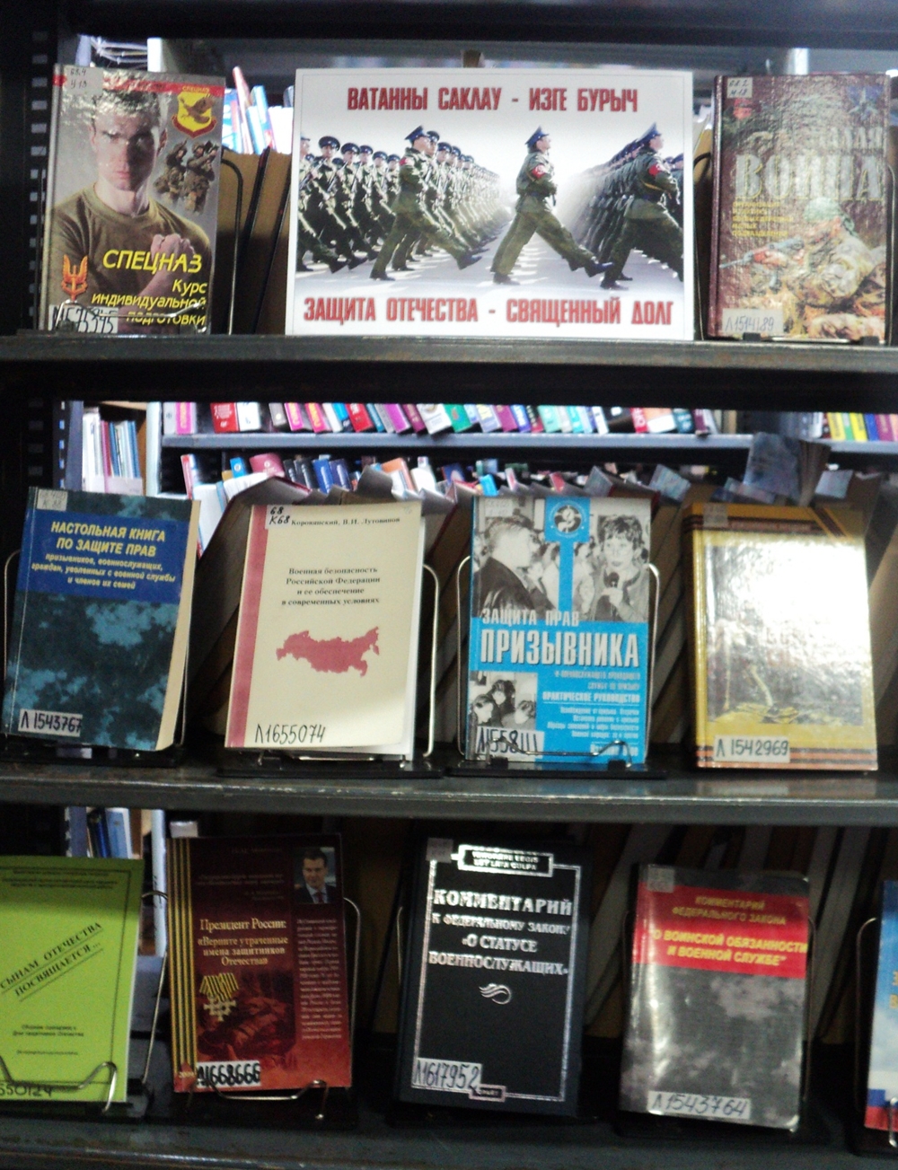Отличительная черта выставки, посвящённой Дню защитника Отечества – её практическая направленность. Наряду с изданиями, поднимающими вопросы обеспечения военной безопасности Российской Федерации в современных условиях, здесь широко представлены книги, содержащие информацию по защите прав призывников и военнослужащих. Привлекут внимание будущих и настоящих воинов издания, содержащие курс индивидуальной подготовки спецназа, комментарии к Федеральным законам «О статусе военнослужащих», «О воинской обязанности и военной службе».