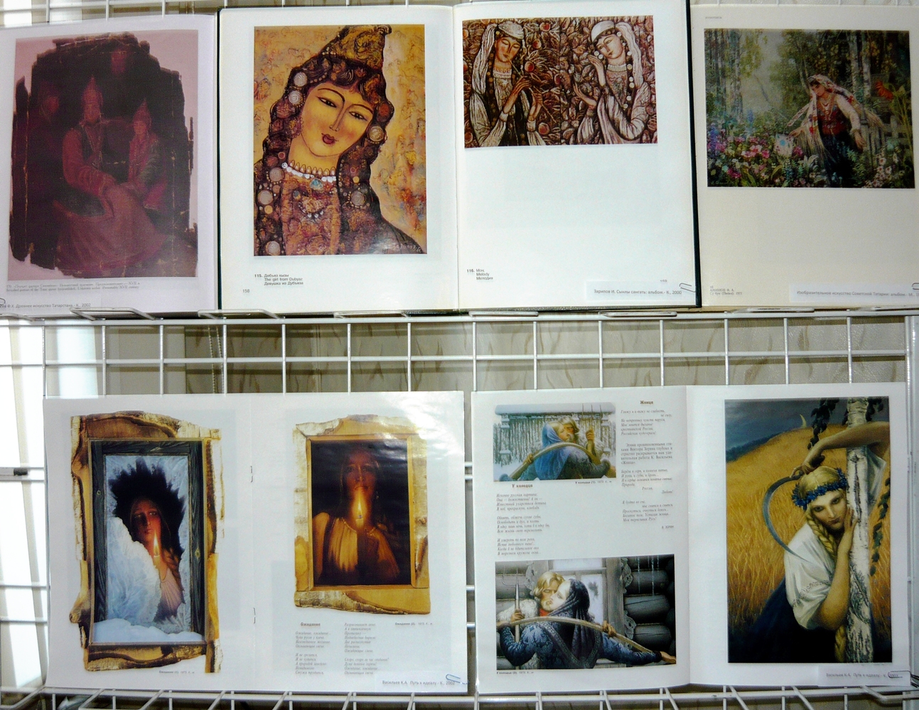 Отдельным блоком на выставке представлены альбомы художников Татарстана, которые изображали в своем творчестве самобытных татарских женщин, от царицы Сююмбике до наших современниц. Среди них Баки Урманче, Ильдар Зарипов, Николай Фешин и др.
