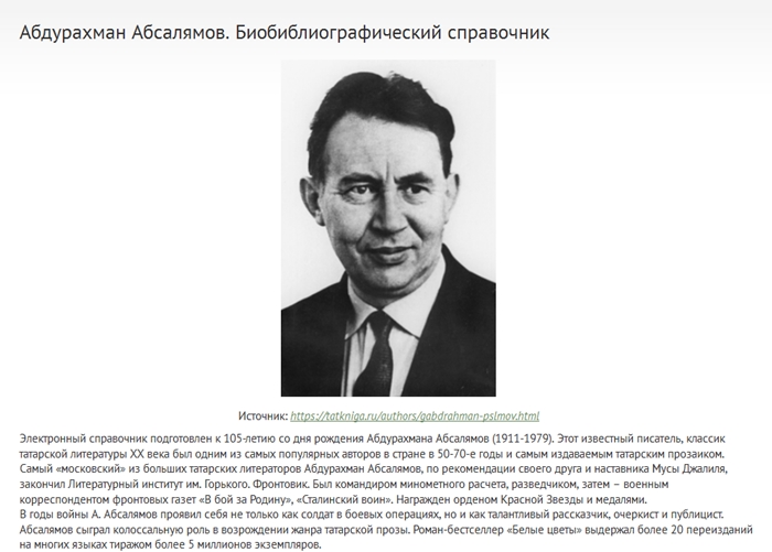 К 105-летию со дня рождения известного писателя, классика татарской литературы ХХ века, подготовлен электронный справочник «Абдурахман Абсалямов».