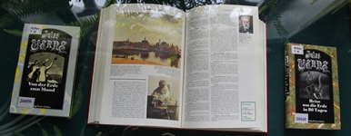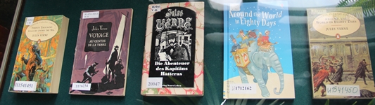 На выставке экспонируются издания на французском, немецком и английском языках, посвящённые жизни и творчеству признанного основателя научной фантастики. Жюль Верн не был «кабинетным» писателем, подобно героям своих книг он много путешествовал на своих яхтах «Сен-Мишель I» и «Сен-Мишель II». В представленных на выставке всемирно известных произведениях «Дети капитана Гранта» и «Пятнадцатилетний капитан» герои идут навстречу трудностям, успешно их преодолевая. Привлечёт внимание посетителей и книга-юбиляр 2017 года «Вокруг света за 80 дней», которой исполнилось 145 лет. Образ главного героя книги Филеаса Фогга сделался воплощением английской невозмутимости и упорства в достижении цели. Выставленные произведения любимого писателя многих поколений читателей, как и всё его творчество, пронизаны верой в будущее прогресса, романтикой науки и преклонением перед творческим разумом. Жюль Верн стал автором 66 романов, более 20 рассказов и 30 пьес.
