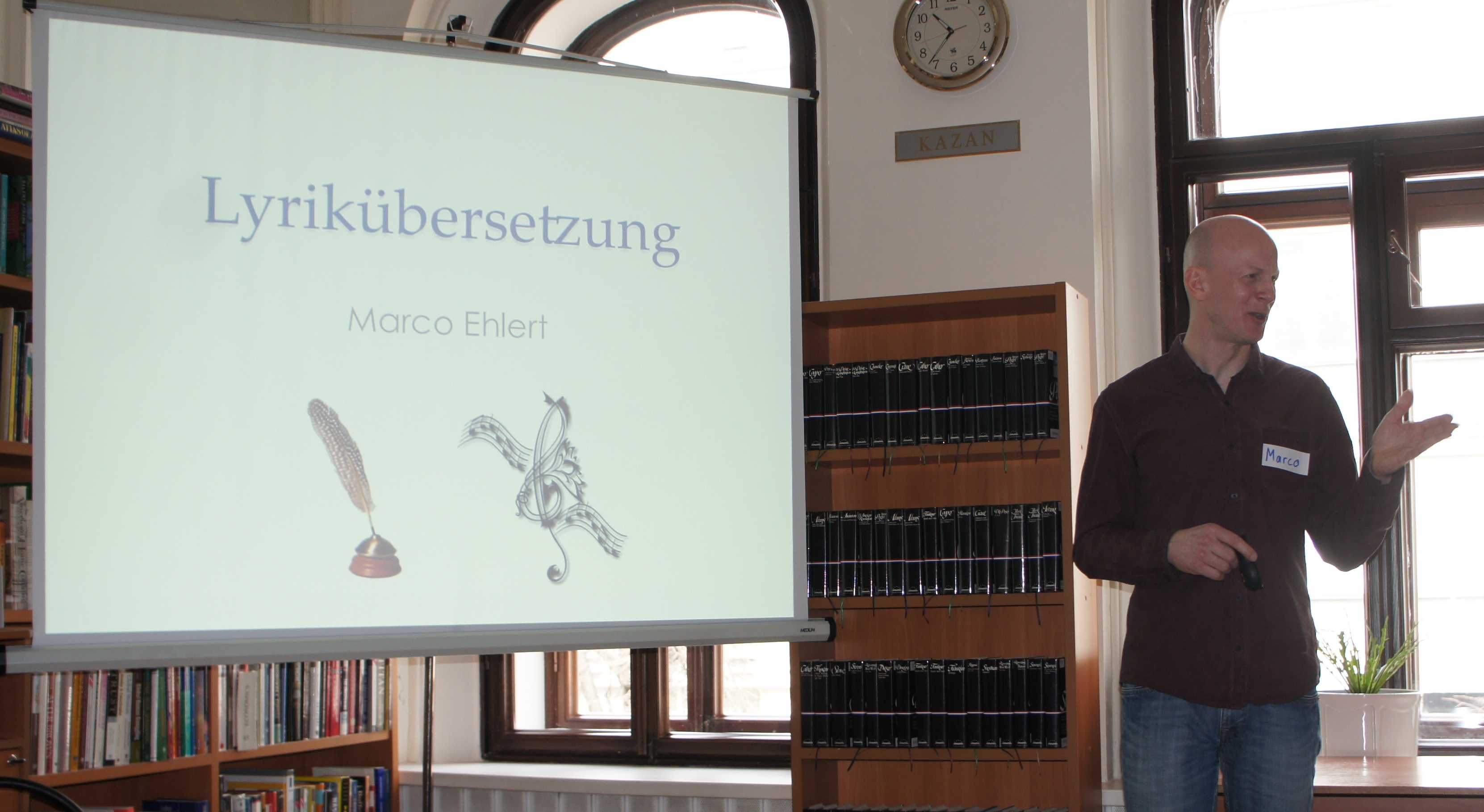27 апреля в Немецком читальном зале отдела литературы на иностранных языках состоялся мастер-класс по лирическому переводу. Модератором выступил Марко Элерт, дипломированный программист, работающий в институте Макса-Планка (Германия). В свободное от работы время Марко переводит любимые русские песни на немецкий язык и исполняет их под аккомпанемент гитары, которой мастерски владеет.