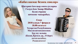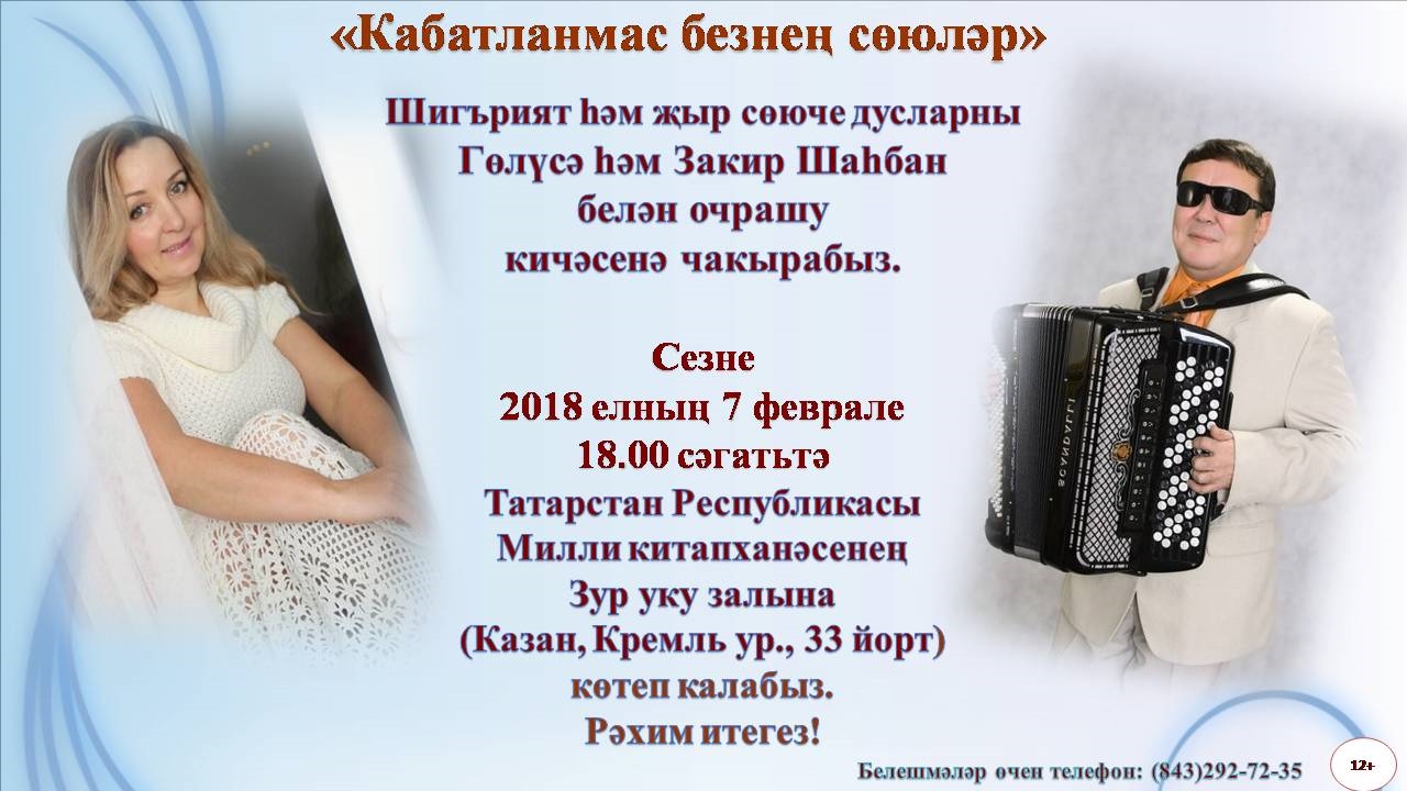 2018 елның 7 феврале көнне 18.00 сәгатьтә Татарстан Республикасы Милли китапханәсенең Зур уку залында (Казан шәһәре, Кремль урамы, 33 йорт) «Кабатланмас безнең сөюләр» дип аталган әдәби-музыкаль кичәдә Гөлүсә һәм Закир Шаһбаннар белән очрашуга чакырабыз.