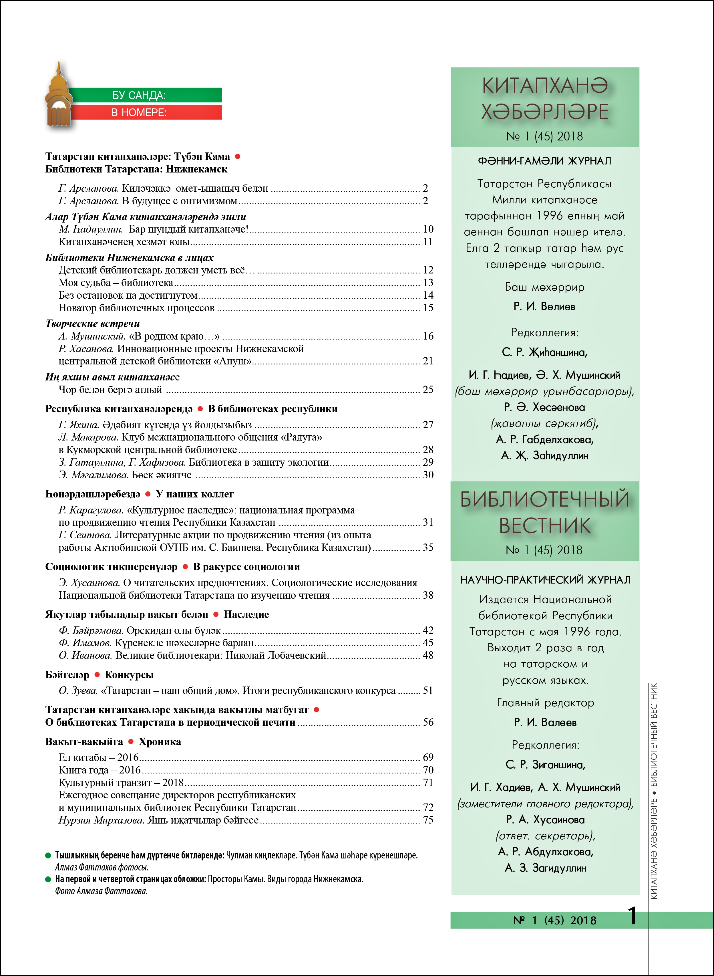 «Китапханә хәбәрләре» журналының 2018 нче елгы беренче саны дөнья күрде. Аның зур өлеше Түбән Кама шәһәре һәм районы китапханәләренең күпкырлы һәм нәтиҗәле эшчәнлегенә багышланган. Түбән Каманың Габдулла Тукай исемендәге Үзәк китапханәсендә 2015 нче елда зур үзгәрешләр булган: капиталь төзекләндерү үткәрелгән, китапханә мәйданнары үзгәртеп корылган, яңа җиһазлар куелган, китаплар һәм матбугат басмалары ачык кулланылышка чыгарылган. Китапханәдә уздырылган кызыклы очрашулар, балалар белән эшчәнлек, китапханә ветераннарының эш тәҗрибәләрен чагылдырган эчтәлекле, мавыктыргыч мәкаләләр журналның махсус сәхифәләрендә урын алган.